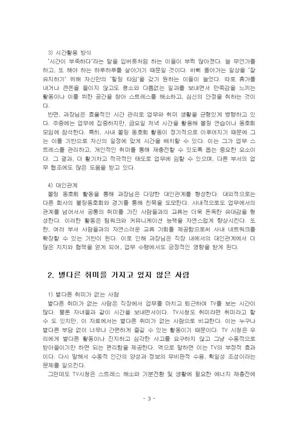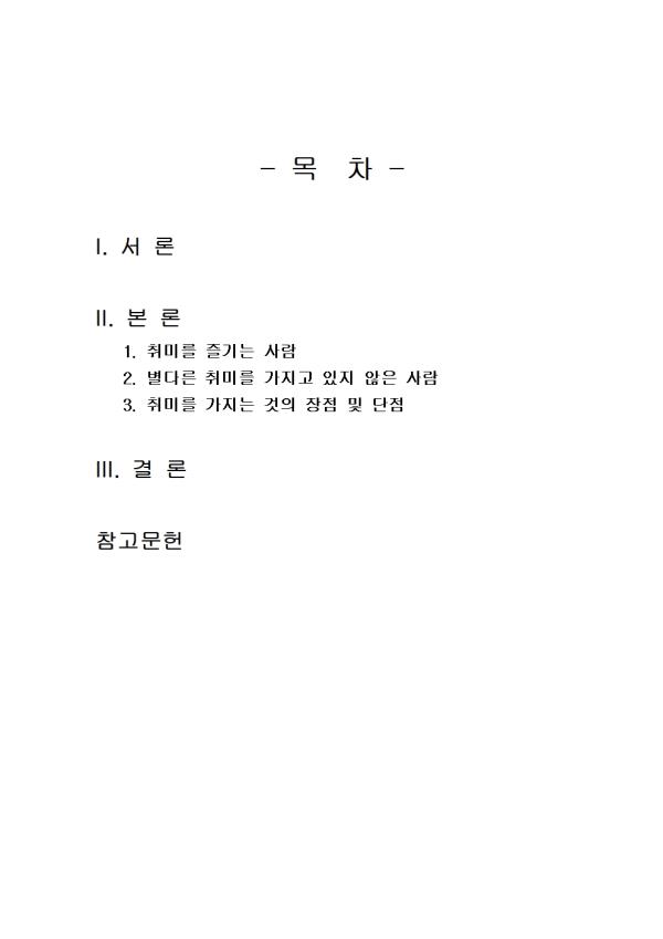 - ¸ñ Â÷ - I. ¼ ·Ð II. º» ·Ð 1. Ãë¹Ì¸¦ Áñ±â´Â »ç¶÷ 2. º°´Ù¸¥ Ãë¹Ì¸¦ °¡Áö°í ÀÖÁö ¾ÊÀº »ç¶÷ 3. Ãë¹Ì¸¦ °¡Áö´Â °ÍÀÇ ÀåÁ¡ ¹× ´ÜÁ¡ III. °á ·Ð Âü°í¹®Çå ** ÇÔ²² Á¦°øµÇ´Â Âü°íÀÚ·á ÇÑ±ÛÆÄÀÏ ** 1. ´ëÀΰü°è.hwp 2. ´ëÀΰü°è2.hwp 3. »î¿¡ ´ëÇÑ ¸¸Á·µµ.hwp 4. »î¿¡ ´ëÇÑ ¸¸Á·µµ2.hwp 5. ½Ã°£ Ȱ¿ë ¹æ½Ä.hwp 6. ½Ã°£ Ȱ¿ë ¹æ½Ä2.hwp 7. Ãë¹Ì¸¦ °¡Áö´Â °ÍÀÇ ÀåÁ¡ ¹× ´ÜÁ¡.hwp 8. ¼·Ð ÀÛ¼º½Ã ÂüÁ¶.hwp 9. °á·Ð ÀÛ¼º½Ã ÂüÁ¶.hwp 10. ¼·Ð ÀÛ¼º½Ã ÂüÁ¶2.hwp 11. °á·Ð ÀÛ¼º½Ã ÂüÁ¶2.hwp ¢ºÀÚ·á³»¿ë ¹Ì¸®º¸±â