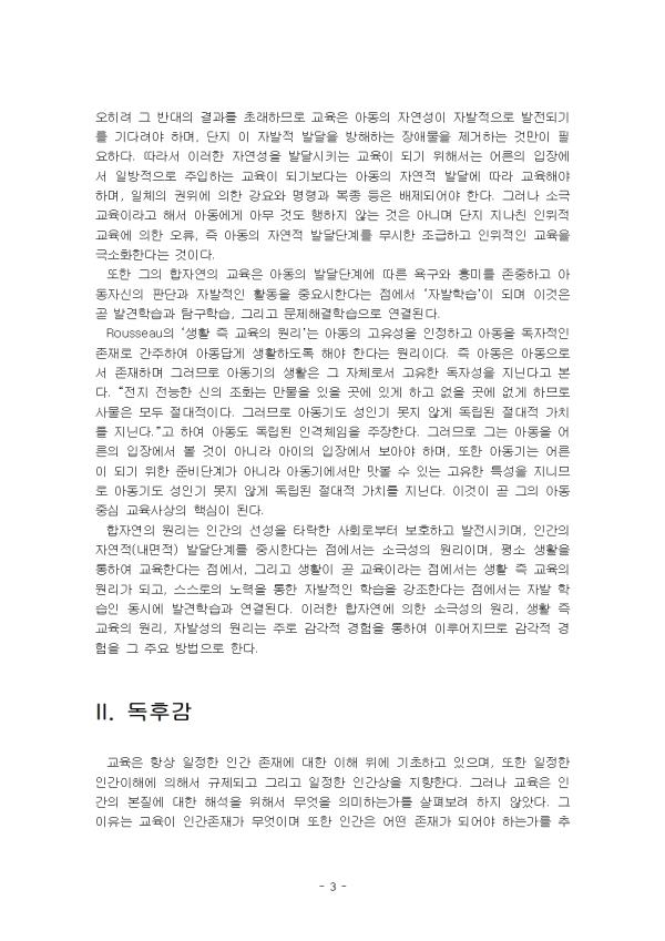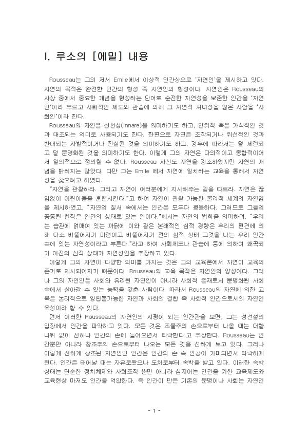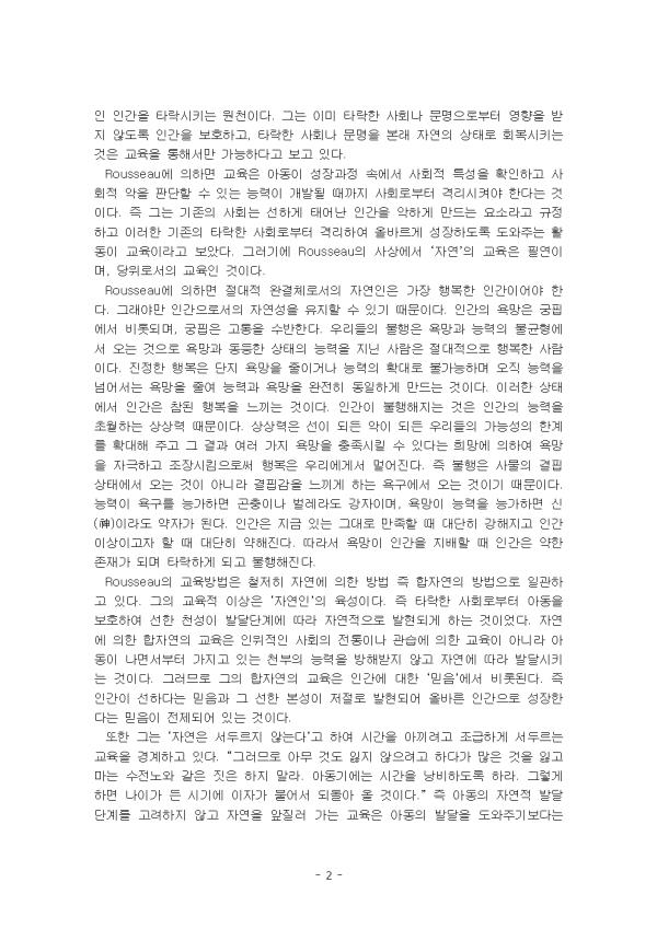 Rousseau´Â ±×ÀÇ Àú¼ Emile¿¡¼ ÀÌ»óÀû Àΰ£»óÀ¸·Î ¡®ÀÚ¿¬ÀΡ¯À» Á¦½ÃÇϰí ÀÖ´Ù. ÀÚ¿¬ÀÇ ¸ñÀûÀº ¿ÏÀüÇÑ Àΰ£ÀÇ Çü¼º Áï ÀÚ¿¬ÀÎÀÇ Çü¼ºÀÌ´Ù. ÀÚ¿¬ÀÎÀº RousseauÀÇ »ç»ó Áß¿¡¼ Áß¿äÇÑ °³³äÀ» Çü¼ºÇÏ´Â ´Ü¾î·Î ¼øÀüÇÑ ÀÚ¿¬¼ºÀ» º¸Á¸ÇÑ Àΰ£À» ¡®ÀÚ¿¬ÀΡ¯À̶ó ºÎ¸£°í »çȸÀûÀÎ Á¦µµ¿Í °ü½À¿¡ ÀÇÇØ ±× ÀÚ¿¬Àû ó³à¼ºÀ» ÀÒÀº »ç¶÷À» ¡®»çȸÀΡ¯À̶ó ÇÑ´Ù. RousseauÀÇ ÀÚ¿¬Àº ¼±Ãµ¼º(innare)À» ÀǹÌÇϱ⵵ Çϰí, ÀÎÀ§Àû ȤÀº °¡½ÄÀûÀÎ °Í°ú ´ëÁ¶µÇ´Â Àǹ̷Π»ç¿ëµÇ±âµµ ÇÑ´Ù. ÇÑÆíÀ¸·Î ÀÚ¿¬Àº Á¶À۵ǰųª À§¼±ÀûÀÎ °Í°ú ¹Ý´ëµÇ´Â ÀÚ¹ßÀûÀ̰ųª Áø½ÇµÈ °ÍÀ» ÀǹÌÇϱ⵵ Çϰí, °æ¿ì¿¡ µû¶ó¼´Â ´ú ¼¼·ÃµÇ°í ´ú ¹®¸íÈµÈ °ÍÀ» ÀǹÌÇϱ⵵ ÇÑ´Ù. ÀÌ·¸°Ô ±×ÀÇ ÀÚ¿¬Àº ´ÙÀÇÀûÀ̰í Á¾ÇÕÀûÀÌ¾î¼ ÀÏÀÇÀûÀ¸·Î Á¤ÀÇÇÒ ¼ö ¾ø´Ù. Rousseau Àڽŵµ ÀÚ¿¬À» °Á¶ÇÏ¿´Áö¸¸ ÀÚ¿¬ÀÇ °³³äÀ» ¹àÈ÷Áö´Â ¾Ê¾Ò´Ù. ´Ù¸¸ ±×´Â Emile ¿¡¼ ÀÚ¿¬¿¡ ÀÏÄ¡ÇÏ´Â ±³À°À» ÅëÇØ¼ ÀÚ¿¬¼ºÀ» ãÀ¸·Á°í ÇÏ¿´´Ù. ¡°ÀÚ¿¬À» °üÂûÇ϶ó. ±×¸®°í ÀÚ¿¬ÀÌ ¿©·¯ºÐ¿¡°Ô Áö½ÃÇØÁÖ´Â ±æÀ» µû¸£¶ó. ÀÚ¿¬Àº ²÷ÀÓ¾øÀÌ ¾î¸°À̵éÀ» ÈÆ·Ã½ÃŲ´Ù.¡±°í ÇÏ¿© ÀÚ¿¬ÀÌ °üÂû °¡´ÉÇÑ ¹°¸®Àû ¼¼°èÀÇ ÀÚ¿¬ÀÓÀ» Á¦½ÃÇÏ¿´°í, ¡°ÀÚ¿¬ÀÇ Áú¼ ¼Ó¿¡¼´Â Àΰ£Àº ¸ðµÎ´Ù ÆòµîÇÏ´Ù. ±×·¯¹Ç·Î ±×µéÀÇ °øÅëµÈ õÁ÷Àº Àΰ£ÀÇ »óÅ·ΠÀÖ´Â ÀÏÀÌ´Ù.¡±¿¡¼´Â ÀÚ¿¬ÀÇ ¹ýÄ¢À» ÀǹÌÇϸç, ¡°¿ì¸®´Â ½À°ü¿¡ ¾ô¸Å¿© ÀÖ´Â ±î´ß¿¡ ÀÌ¿Í °°Àº º»·¡ÀûÀÎ ½ÉÀû °æÇâÀº ¿ì¸®ÀÇ Æí°ß¿¡ ÀÇÇØ ´Ù¼Ò ºñ¶Ô¾îÁö±â ¸¶·ÃÀÌ°í ºñ¶Ô¾îÁö±â ÀüÀÇ ½ÉÀû »óÅ ±×°ÍÀ» ³ª´Â ¿ì¸® Àΰ£ ¼Ó¿¡ ÀÖ´Â ÀÚ¿¬¼ºÀ̶ó°í ºÎ¸¥´Ù.¡±¶ó°í ÇÏ¿© »çȸÁ¦µµ³ª °ü½À¿¡ µî¿¡ ÀÇÇÏ¿© ¿Ö°îµÇ±â ÀÌÀüÀÇ ½ÉÀû »óŰ¡ ÀÚ¿¬¼ºÀÓÀ» ÁÖÀåÇϰí ÀÖ´Ù. ÀÌ·¸°Ô ±×ÀÇ ÀÚ¿¬ÀÌ ´Ù¾çÇÑ Àǹ̸¦ °¡Áö´Â °ÍÀº ±×ÀÇ ±³À°·Ð¿¡¼ ÀÚ¿¬ÀÌ ±³À°ÀÇ ÁذŷΠÁ¦½ÃµÇ¾îÁö±â ¶§¹®ÀÌ´Ù. RousseauÀÇ ±³À° ¸ñÀûÀº ÀÚ¿¬ÀÎÀÇ ¾ç¼ºÀÌ´Ù. ±×·¯³ª ±×ÀÇ ÀÚ¿¬ÀÎÀº »çȸ¿Í À¯¸®µÈ ÀÚ¿¬ÀÎÀÌ ¾Æ´Ï¶ó »çȸÀû Á¸Àç·Î¼ ¹®¸íÈµÈ »çȸ ¼Ó¿¡¼ »ì¾Æ°¥ ¼ö ÀÖ´Â ´É·ÂÀ» °®Ãá »ç¶÷ÀÌ´Ù. µû¶ó¼ RousseauÀÇ ÀÚ¿¬¿¡ ÀÇÇÑ ±³À°Àº ³í¸®ÀûÀ¸·Î ¾ç¸³ºÒ°¡´ÉÇÑ ÀÚ¿¬°ú »çȸÀÇ °áÇÕ Áï »çȸÀû Àΰ£À¸·Î¼ÀÇ ÀÚ¿¬ÀÎ À°¼ºÀ̶ó ÇÒ ¼ö ÀÖ´Ù. ¸ÕÀú ÀÌ·¯ÇÑ RousseauÀÇ ÀÚ¿¬ÀÎÀÇ ÁöÆòÀÌ µÇ´Â Àΰ£°üÀ» º¸¸é, ±×´Â ¼º¼±¼³ÀÇ ÀÔÀå¿¡¼ Àΰ£À» ÆÄ¾ÇÇϰí ÀÖ´Ù. ¸ðµç °ÍÀº Á¶¹°ÁÖÀÇ ¼ÕÀ¸·ÎºÎÅÍ ³ª¿Ã ¶§´Â ´õÇÒ ³ªÀ§ ¾øÀÌ ¼±Çϳª Àΰ£ÀÇ ¼Õ¿¡ µé¾î¿À¸é¼ Ÿ¶ôÇÑ´Ù.°í ÁÖÀåÇÑ´Ù. Rousseau´Â Àΰ£»Ó¸¸ ¾Æ´Ï¶ó âÁ¶ÁÖÀÇ ¼ÕÀ¸·ÎºÎÅÍ ³ª¿À´Â ¸ðµç °ÍÀ» ¼±ÇÏ°Ô º¸°í ÀÖ´Ù. ±×·¯³ª ÀÌ·¸°Ô ¼±ÇÏ°Ô Ã¢Á¶µÈ ÀÚ¿¬ÀÎÀÎ Àΰ£Àº Àΰ£ÀÇ ¼Õ Áï ÀΰøÀÌ °¡¹ÌµÇ¸é¼ Ÿ¶ôÇÏ°Ô µÈ´Ù. Àΰ£Àº ž ¶§´Â ÀÚÀ¯·Î¿ÔÀ¸³ª µµÃ³·ÎºÎÅÍ ¼Ó¹ÚÀ» ¹Þ°í ÀÖ´Ù. ÀÌ·¯ÇÑ ¼Ó¹Ú »óÅ´ ´Ü¼øÇÑ Á¤Ä¡Ã¼Á¦¿Í »çȸÁ¶Á÷ »Ó¸¸ ¾Æ´Ï¶ó ½ÉÁö¾î´Â Àΰ£À» À§ÇÑ ±³À°Á¦µµ¿Í ±³À°Çö»ó ¸¶Àúµµ Àΰ£À» ¾ï¾ÐÇÑ´Ù. Áï Àΰ£ÀÌ ¸¸µç ±âÁ¸ÀÇ ¹®¸íÀ̳ª »çȸ´Â ÀÚ¿¬ÀÎÀÎ Àΰ£À» Ÿ¶ô½ÃŰ´Â ¿øÃµÀÌ´Ù. ±×´Â ÀÌ¹Ì Å¸¶ôÇÑ »çȸ³ª ¹®¸íÀ¸·ÎºÎÅÍ ¿µÇâÀ» ¹ÞÁö ¾Êµµ·Ï Àΰ£À» º¸È£Çϰí, Ÿ¶ôÇÑ »çȸ³ª ¹®¸íÀ» º»·¡ ÀÚ¿¬ÀÇ »óÅ·Πȸº¹½ÃŰ´Â °ÍÀº ±³À°À» ÅëÇØ¼¸¸ °¡´ÉÇÏ´Ù°í º¸°í ÀÖ´Ù. Rousseau¿¡ ÀÇÇÏ¸é ±³À°Àº ¾Æµ¿ÀÌ ¼ºÀå°úÁ¤ ¼Ó¿¡¼ »çȸÀû Ư¼ºÀ» È®ÀÎÇÏ°í »çȸÀû ¾ÇÀ» ÆÇ´ÜÇÒ ¼ö ÀÖ´Â ´É·ÂÀÌ °³¹ßµÉ ¶§±îÁö »çȸ·ÎºÎÅÍ °Ý¸®½ÃÄÑ¾ß ÇÑ´Ù´Â °ÍÀÌ´Ù. Áï ±×´Â ±âÁ¸ÀÇ »çȸ´Â ¼±ÇÏ°Ô ÅÂ¾î³ Àΰ£À» ¾ÇÇÏ°Ô ¸¸µå´Â ¿ä¼Ò¶ó°í ±ÔÁ¤Çϰí ÀÌ·¯ÇÑ ±âÁ¸ÀÇ Å¸¶ôÇÑ »çȸ·ÎºÎÅÍ °Ý¸®ÇÏ¿© ¿Ã¹Ù¸£°Ô ¼ºÀåÇϵµ·Ï µµ¿ÍÁִ Ȱµ¿ÀÌ ±³À°À̶ó°í º¸¾Ò´Ù. ±×·¯±â¿¡ RousseauÀÇ »ç»ó¿¡¼ ¡®ÀÚ¿¬¡¯ÀÇ ±³À°Àº ÇÊ¿¬À̸ç, ´çÀ§·Î¼ÀÇ ±³À°ÀÎ °ÍÀÌ´Ù. Rousseau¿¡ ÀÇÇϸé Àý´ëÀû ¿Ï°áü·Î¼ÀÇ ÀÚ¿¬ÀÎÀº °¡Àå ÇູÇÑ Àΰ£À̾î¾ß ÇÑ´Ù. ±×·¡¾ß¸¸ Àΰ£À¸·Î¼ÀÇ ÀÚ¿¬¼ºÀ» À¯ÁöÇÒ ¼ö Àֱ⠶§¹®ÀÌ´Ù. Àΰ£ÀÇ ¿å¸ÁÀº ±ÃÇÌ¿¡¼ ºñ·ÔµÇ¸ç, ±ÃÇÌÀº °íÅëÀ» ¼ö¹ÝÇÑ´Ù. ¿ì¸®µéÀÇ ºÒÇàÀº ¿å¸Á°ú ´É·ÂÀÇ ºÒ±ÕÇü¿¡¼ ¿À´Â °ÍÀ¸·Î ¿å¸Á°ú µ¿µîÇÑ »óÅÂÀÇ ´É·ÂÀ» Áö´Ñ »ç¶÷Àº Àý´ëÀûÀ¸·Î ÇູÇÑ »ç¶÷ÀÌ´Ù. ÁøÁ¤ÇÑ ÇູÀº ´ÜÁö ¿å¸ÁÀ» ÁÙÀ̰ųª ´É·ÂÀÇ È®´ë·Î ºÒ°¡´ÉÇÏ¸ç ¿ÀÁ÷ ´É·ÂÀ» ³Ñ¾î¼´Â ¿å¸ÁÀ» ÁÙ¿© ´É·Â°ú ¿å¸ÁÀ» ¿ÏÀüÈ÷ µ¿ÀÏÇÏ°Ô ¸¸µå´Â °ÍÀ