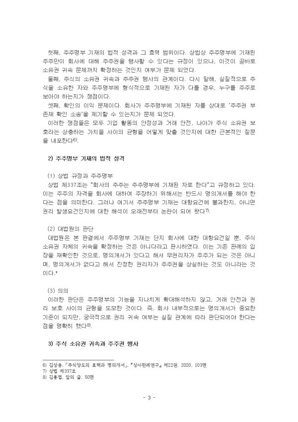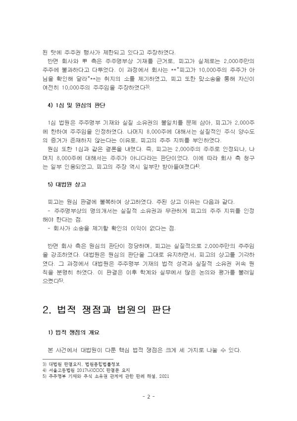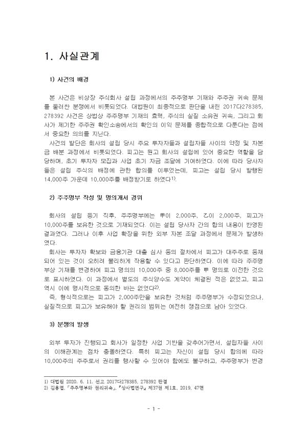 1) »ç°ÇÀÇ ¹è°æ º» »ç°ÇÀº ºñ»óÀå ÁÖ½Äȸ»ç ¼³¸³ °úÁ¤¿¡¼ÀÇ ÁÖÁÖ¸íºÎ ±âÀç¿Í ÁÖÁÖ±Ç ±Í¼Ó ¹®Á¦¸¦ µÑ·¯½Ñ ºÐÀï¿¡¼ ºñ·ÔµÇ¾ú´Ù. ´ë¹ý¿øÀÌ ÃÖÁ¾ÀûÀ¸·Î ÆÇ´ÜÀ» ³»¸° 2017´Ù278385, 278392 »ç°ÇÀº »ó¹ý»ó ÁÖÁÖ¸íºÎ ±âÀçÀÇ È¿·Â, ÁÖ½ÄÀÇ ½ÇÁú ¼ÒÀ¯±Ç ±Í¼Ó, ±×¸®°í ȸ»ç°¡ Á¦±âÇÑ ÁÖÁÖ±Ç È®ÀμҼۿ¡¼ÀÇ È®ÀÎÀÇ ÀÌÀÍ ¹®Á¦¸¦ Á¾ÇÕÀûÀ¸·Î ´Ù·é´Ù´Â Á¡¿¡¼ Áß¿äÇÑ ÀÇÀǸ¦ Áö´Ñ´Ù. »ç°ÇÀÇ ¹ß´ÜÀº ȸ»çÀÇ ¼³¸³ ´ç½Ã ÁÖ¿ä ÅõÀÚÀÚµé°ú ¼³¸³ÀÚµé »çÀÌÀÇ ¾àÁ¤ ¹× ÀÚº»±Ý ¹èºÐ °úÁ¤¿¡¼ ºñ·ÔµÇ¾ú´Ù. Çǰí´Â ¿ø°í ȸ»çÀÇ ¼³¸³¿¡ ÀÖ¾î Áß¿äÇÑ ¿ªÇÒÀ» ´ã´çÇϸç, Ãʱâ ÅõÀÚÀÚ ¸ðÁý°ú »ç¾÷ Ãʱâ ÀÚ±Ý Á¶´Þ¿¡ ±â¿©ÇÏ¿´´Ù. ÀÌ¿¡ µû¶ó ´ç»çÀÚµéÀº ¼³¸³ ÁÖ½ÄÀÇ ¹èÁ¤¿¡ °üÇÑ ÇÕÀǸ¦ ÀÌ·ç¾ú´Âµ¥, Çǰí´Â ¼³¸³ ´ç½Ã ¹ßÇàµÈ 14,000ÁÖ °¡¿îµ¥ 10,000ÁÖ¸¦ ¹èÁ¤¹Þ±â·Î ÇÏ¿´´Ù ´ë¹ý¿ø 2020. 6. 11. ¼±°í 2017´Ù278385, 278392 ÆÇ°á . 2) ÁÖÁÖ¸íºÎ ÀÛ¼º ¹× ¸íÀǰ³¼ °æÀ§ ȸ»çÀÇ ¼³¸³ µî±â Á÷ÈÄ, ÁÖÁÖ¸íºÎ¿¡´Â Ë£ÀÌ 2,000ÁÖ, ëàÀÌ 2,000ÁÖ, ÇÇ°í°¡ 10,000ÁÖ¸¦ º¸À¯ÇÑ °ÍÀ¸·Î ±âÀçµÇ¾ú´Ù. ÀÌ´Â ¼³¸³ ´ç»çÀÚ °£ÀÇ ÇÕÀÇ ³»¿ëÀÌ ¹Ý¿µµÈ °á°ú¿´´Ù. ±×·¯³ª ÀÌÈÄ »ç¾÷ È®ÀåÀ» À§ÇÑ ¿ÜºÎ ÀÚº» Á¶´Þ °úÁ¤¿¡¼ ¹®Á¦°¡ ¹ß»ýÇÏ¿´´Ù. ȸ»ç´Â ÅõÀÚÀÚ È®º¸¿Í ±ÝÀ¶±â°ü ´ëÃâ ½É»ç µîÀÇ ÀýÂ÷¿¡¼ ÇÇ°í°¡ ´ëÁÖÁÖ·Î µîÀçµÇ¾î ÀÖ´Â °ÍÀÌ ¿ÀÈ÷·Á ºÒ¸®ÇÏ°Ô ÀÛ¿ëÇÒ ¼ö ÀÖ´Ù°í ÆÇ´ÜÇÏ¿´´Ù. ÀÌ¿¡ µû¶ó ÁÖÁÖ¸íºÎ»ó ±âÀ縦 º¯°æÇÏ¿© ÇÇ°í ¸íÀÇÀÇ 10,000ÁÖ Áß 8,000ÁÖ¸¦ Ë£ ¸íÀÇ·Î ÀÌÀüÇÑ °ÍÀ¸·Î Ç¥½ÃÇÏ¿´´Ù. ÀÌ °úÁ¤¿¡¼ º°µµÀÇ Áֽľç¼öµµ °è¾àÀÌ Ã¼°áµÈ ÀûÀº ¾ø¾ú°í, ÇÇ°í ¿ª½Ã ÀÌ¿¡ ¸í½ÃÀûÀ¸·Î µ¿ÀÇÇÑ ¹Ù´Â ¾ø¾ú´Ù ±èÈ«¿±, ¡¸ÁÖÁÖ¸íºÎ¿Í ±Ç¸®±Í¼Ó¡¹, ¡º»ó»ç¹ý¿¬±¸¡» Á¦37±Ç Á¦1È£, 2019, 47¸é . Áï, Çü½ÄÀûÀ¸·Î´Â ÇÇ°í°¡ 2,000ÁÖ¸¸À» º¸À¯ÇÑ °Íó·³ ÁÖÁÖ¸íºÎ°¡ ¼öÁ¤µÇ¾úÀ¸³ª, ½ÇÁúÀûÀ¸·Î ÇÇ°í°¡ º¸À¯ÇØ¾ß ÇÒ ±Ç¸®ÀÇ ¹üÀ§´Â ¿©ÀüÈ÷ ÀïÁ¡À¸·Î ³²¾Æ ÀÖ¾ú´Ù. 3) ºÐÀïÀÇ ¹ß»ý ¿ÜºÎ ÅõÀÚ°¡ ÁøÇàµÇ°í ȸ»ç°¡ ÀÏÁ¤ÇÑ »ç¾÷ ±â¹ÝÀ» °®Ã߾¸é¼, ¼³¸³ÀÚµé »çÀÌÀÇ ÀÌÇØ°ü°è´Â Á¡Â÷ Ãæµ¹ÇÏ¿´´Ù. ƯÈ÷ Çǰí´Â ÀÚ½ÅÀÌ ¼³¸³ ´ç½Ã ÇÕÀÇ¿¡ µû¶ó 10,000ÁÖÀÇ ÁÖÁַμ ±Ç¸®¸¦ Çà»çÇÒ ¼ö ÀÖ¾î¾ß ÇÔ¿¡µµ ºÒ±¸Çϰí, ÁÖÁÖ¸íºÎ°¡ º¯°æµÈ Å¿¿¡ ÁÖÁÖ±Ç Çà»ç°¡ Á¦Çѵǰí ÀÖ´Ù°í ÁÖÀåÇÏ¿´´Ù. ¹Ý¸é ȸ»ç¿Í Ë£ ÃøÀº ÁÖÁÖ¸íºÎ»ó ±âÀ縦 ±Ù°Å·Î, ÇÇ°í°¡ ½ÇÁ¦·Î´Â 2,000ÁÖ¸¸ÀÇ ÁÖÁÖ¿¡ ºÒ°úÇÏ´Ù°í ´ÙÅõ¾ú´Ù. ÀÌ °úÁ¤¿¡¼ ȸ»ç´Â **¡°ÇÇ°í°¡ 10,000ÁÖÀÇ ÁÖÁÖ°¡ ¾Æ´ÔÀ» È®ÀÎÇØ ´Þ¶ó¡±**´Â ÃëÁöÀÇ ¼Ò¸¦ Á¦±âÇÏ¿´°í, ÇÇ°í ¶ÇÇÑ ¸Â¼Ò¼ÛÀ» ÅëÇØ ÀÚ½ÅÀÌ ¿©ÀüÈ÷ 10,000ÁÖÀÇ ÁÖÁÖÀÓÀ» ÁÖÀåÇÏ¿´´Ù ´ë¹ý¿ø ÆÇ°á¿äÁö, ¹ý¿øÁ¾ÇÕ¹ý·üÁ¤º¸ . 4) 1½É ¹× ¿ø½ÉÀÇ ÆÇ´Ü 1½É ¹ý¿øÀº ÁÖÁÖ¸íºÎ ±âÀç¿Í ½ÇÁú ¼ÒÀ¯±ÇÀÇ ºÒÀÏÄ¡¸¦ ¹®Á¦ »ï¾Æ, ÇÇ°í°¡ 2,000ÁÖ¿¡ ÇÑÇÏ¿© ÁÖÁÖÀÓÀ» ÀÎÁ¤ÇÏ¿´´Ù. ³ª¸ÓÁö 8,000ÁÖ¿¡ ´ëÇØ¼´Â ½ÇÁúÀûÀÎ ÁÖ½Ä ¾ç¼öµµÀÇ Áõ°Å°¡ Á¸ÀçÇÏÁö ¾Ê´Â´Ù´Â ÀÌÀ¯·Î, ÇǰíÀÇ ÁÖÁÖ ÁöÀ§¸¦ ºÎÀÎÇÏ¿´´Ù. ¿ø½É ¶ÇÇÑ 1½É°ú °°Àº °á·ÐÀ» ³»·È´Ù. Áï, Çǰí´Â 2,000ÁÖÀÇ ÁÖÁÖ·Î ÀÎÁ¤µÇ³ª, ³ª¸ÓÁö 8,000ÁÖ¿¡ ´ëÇØ¼´Â ÁÖÁÖ°¡ ¾Æ´Ï´Ù¶ó´Â ÆÇ´ÜÀ̾ú´Ù. ÀÌ¿¡ µû¶ó ȸ»ç Ãø û±¸´Â ÀϺΠÀοëµÇ¾ú°í, ÇǰíÀÇ ÁÖÀå ¿ª½Ã ÀϺθ¸ ¹Þ¾Æµé¿©Á³´Ù ¼¿ï°íµî¹ý¿ø 2017³ªXXXX ÆÇ°á¹® ¿äÁö . 5) ´ë¹ý¿ø »ó°í Çǰí´Â ¿ø½É ÆÇ°á¿¡ ºÒº¹ÇÏ¿© »ó°íÇÏ¿´´Ù. ÁÖµÈ »ó°í ÀÌÀ¯´Â ´ÙÀ½°ú °°´Ù. - ÁÖÁÖ¸íºÎ»óÀÇ ¸íÀǰ³¼´Â ½ÇÁúÀû ¼ÒÀ¯±Ç°ú ¹«°üÇÏ°Ô ÇǰíÀÇ ÁÖÁÖ ÁöÀ§¸¦ ÀÎÁ¤ÇØ¾ß ÇÑ´Ù´Â Á¡. - ȸ»ç°¡ ¼Ò¼ÛÀ» Á¦±âÇÒ È®ÀÎÀÇ ÀÌÀÍÀÌ ¾ø´Ù´Â Á¡. ¹Ý¸é ȸ»ç ÃøÀº ¿ø½ÉÀÇ ÆÇ´ÜÀÌ Á¤´çÇϸç, Çǰí´Â ½ÇÁúÀûÀ¸·Î 2,000ÁÖ¸¸ÀÇ ÁÖÁÖÀÓÀ» °Á¶ÇÏ¿´´Ù. ´ë¹ý¿øÀº ¿ø½ÉÀÇ ÆÇ´ÜÀ» ±×´ë·Î À¯ÁöÇϸé¼, ÇǰíÀÇ »ó°í¸¦ ±â°¢ÇÏ¿´´Ù. ±× °úÁ¤¿¡¼ ´ë¹ý¿øÀº ÁÖÁÖ¸íºÎ ±âÀçÀÇ ¹ýÀû ¼º°Ý°ú ½ÇÁúÀû ¼ÒÀ¯±Ç ±Í¼Ó ¿øÄ¢À» ºÐ¸íÈ÷ ÇÏ¿´´Ù. ÀÌ ÆÇ°áÀº ÀÌÈÄ Çаè¿Í ½Ç¹«¿¡¼ ¸¹Àº ³íÀÇ¿Í Æò°¡¸¦ ºÒ·¯ÀÏÀ¸Ä×´Ù ÁÖÁÖ¸íºÎ ±âÀç¿Í ÁÖ½Ä ¼ÒÀ¯±Ç °ü°è¿¡ °üÇÑ ÆÇ·Ê ÇØ¼³, 2021 . - Áß·« - |