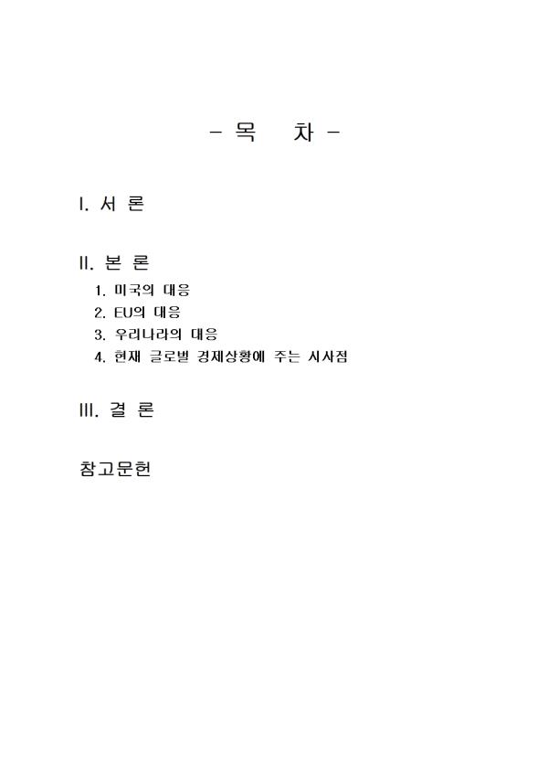 - ¸ñ Â÷ - I. ¼ ·Ð II. º» ·Ð 1. ¹Ì±¹ÀÇ ´ëÀÀ 2. EUÀÇ ´ëÀÀ 3. ¿ì¸®³ª¶óÀÇ ´ëÀÀ 4. ÇöÀç ±Û·Î¹ú °æÁ¦»óȲ¿¡ ÁÖ´Â ½Ã»çÁ¡ III. °á ·Ð Âü°í¹®Çå ** ÇÔ²² Á¦°øµÇ´Â Âü°íÀÚ·á ÇÑ±ÛÆÄÀÏ ** 1. EUÀÇ ´ëÀÀ.hwp 2. EUÀÇ ´ëÀÀ2.hwp 3. EUÀÇ ´ëÀÀ3.hwp 4. ¹Ì±¹ÀÇ ´ëÀÀ.hwp 5. ¹Ì±¹ÀÇ ´ëÀÀ2.hwp 6. ¹Ì±¹ÀÇ ´ëÀÀ3.hwp 7. ¿ì¸®³ª¶óÀÇ ´ëÀÀ.hwp 8. ¿ì¸®³ª¶óÀÇ ´ëÀÀ2.hwp 9. ¿ì¸®³ª¶óÀÇ ´ëÀÀ3.hwp 10. ÇöÀç ±Û·Î¹ú °æÁ¦»óȲÀÌ ÁÖ´Â ½Ã»çÁ¡.hwp 11. ÇöÀç ±Û·Î¹ú °æÁ¦»óȲÀÌ ÁÖ´Â ½Ã»çÁ¡2.hwp 12. ÇöÀç ±Û·Î¹ú °æÁ¦»óȲÀÌ ÁÖ´Â ½Ã»çÁ¡3.hwp 13. ¼·Ð ÀÛ¼º½Ã ÂüÁ¶.hwp 14. °á·Ð ÀÛ¼º½Ã ÂüÁ¶.hwp 15. ¼·Ð ÀÛ¼º½Ã ÂüÁ¶2.hwp 16. °á·Ð ÀÛ¼º½Ã ÂüÁ¶2.hwp ¢ºÀÚ·á³»¿ë ¹Ì¸®º¸±â