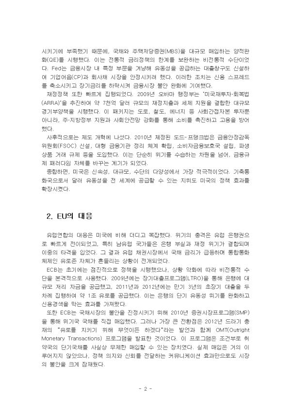 2008³â ±Û·Î¹ú ±ÝÀ¶À§±â´Â 20¼¼±â ´ë°øÈ² ÀÌÈÄ °¡Àå ½É°¢ÇÑ ±ÝÀ¶¡¤°æÁ¦Àû Ãæ°ÝÀ¸·Î ±â·ÏµÈ´Ù. ¹Ì±¹ÀÇ ÁÖÅýÃÀå °Åǰ ºØ±«¿Í ¼ºêÇÁ¶óÀÓ ¸ð±âÁö ºÎ½ÇÀº Áõ±ÇÈ ±ÝÀ¶»óǰÀÇ ÆÄ±ÞÈ¿°ú¸¦ ÅëÇØ ´ëÇü ÅõÀÚÀºÇàÀÇ ÆÄ»êÀ¸·Î À̾îÁ³´Ù. ¸®¸Õ ºê¶ó´õ½ºÀÇ ÆÄ»êÀº Àü ¼¼°è ±ÝÀ¶½Ã½ºÅÛÀÇ ºÒ¾ÈÀ» ÁõÆø½ÃÄ×°í, ±¹Á¦±ÝÀ¶½ÃÀåÀÇ ½Å¿ë °æ»öÀº ½Ç¹°°æÁ¦·Î ±Þ¼ÓÈ÷ È®»êµÇ¾ú´Ù. ÁÖ°¡ Æø¶ô, ¿øÀÚÀç °¡°Ý ±Þ¶ô, ±¹Á¦¹«¿ª Ãà¼Ò, ½Ç¾÷·ü ±ÞµîÀÌ µ¿½Ã´Ù¹ßÀûÀ¸·Î ³ªÅ¸³µ´Ù. À§±âÀÇ ¼º°ÝÀº ´Ü¼øÇÑ ±ÝÀ¶ ºÒ¾È¿¡ ±×Ä¡Áö ¾Ê¾Ò´Ù. ±ÝÀ¶°ú ½Ç¹°°æÁ¦°¡ ¼·Î Çǵå¹éÀ» ÁÖ°í¹ÞÀ¸¸é¼ À§±âÀÇ ±Ô¸ð°¡ ÁõÆøµÇ¾ú°í, °¢±¹ °æÁ¦ ±¸Á¶ÀÇ Ãë¾àÇÑ ºÎºÐÀ» µå·¯³Â´Ù. ÀÌ¿¡ µû¶ó °¢±¹ Á¤ºÎ¿Í Áß¾ÓÀºÇàÀº Àü·Ê ¾ø´Â Á¤Ã¥ ¼ö´ÜÀ» µ¿¿øÇÏ¿© À§±â ÁøÁ¤À» ½ÃµµÇÏ¿´´Ù. ¹Ì±¹Àº ±âÃàÅëȱ¹À¸·Î¼ ¼¼°è ´Þ·¯ À¯µ¿¼ºÀ» Ã¥ÀÓÁö´Â À§Ä¡¿¡¼ ½Å¼ÓÇÏ°í ´ë±Ô¸ðÀÇ ´ëÀÀÀ» ÆîÃÆ´Ù. À¯·´¿¬ÇÕÀº ´ÜÀÏÅëȸ¦ À¯ÁöÇϸ鼵µ ÀçÁ¤Àº ºÐ±ÇµÈ ±¸Á¶Àû ÇÑ°è ¼Ó¿¡¼ Á¡ÁøÀû ´ëÀÀÀ» ¸ð»öÇß´Ù. ¿ì¸®³ª¶ó´Â ¿ÜÈÀ¯µ¿¼º ºÎÁ·°ú ´Ü±â ÀÚº»À¯Ã⠾з¿¡ Á÷¸éÇßÁö¸¸, ºñ±³Àû ºü¸£°í ´ÙÃþÀûÀÎ ´ëÀÀÀ» ÅëÇØ À§±â¸¦ Á¶±â¿¡ ¾ÈÁ¤½ÃÄ×´Ù. º» ·¹Æ÷Æ®´Â ¹Ì±¹, EU, ¿ì¸®³ª¶óÀÇ À§±â ´ëÀÀÀ» Â÷·Ê·Î »ìÆìº¸°í, ´ëÀÀÀÇ Æ¯Â¡°ú ÇѰ踦 ºÐ¼®ÇÑ ÈÄ, ÇöÀçÀÇ ±Û·Î¹ú °æÁ¦»óȲ¿¡ ´øÁö´Â ½Ã»çÁ¡À» Á¾ÇÕÀûÀ¸·Î Á¤¸®ÇÑ´Ù. II. º» ·Ð 1. ¹Ì±¹ÀÇ ´ëÀÀ ¹Ì±¹Àº À§±âÀÇ ¹ß¿øÁöÀÌÀÚ ¼¼°è ÃÖ´ë °æÁ¦±¹À¸·Î¼ °¡Àå ¸ÕÀú ´ëÀÀ¿¡ ³ª¼¹´Ù. ¹«¾ùº¸´Ù ±ÝÀ¶½Ã½ºÅÛÀÇ ºØ±«¸¦ ¸·´Â °ÍÀÌ ÃÖ¿ì¼± °úÁ¦¿´´Ù. À̸¦ À§ÇØ ¹Ì±¹ ÀÇȸ´Â 2008³â 10¿ù ¡®±ä±Þ°æÁ¦¾ÈÁ¤È¹ý¡¯À» Á¦Á¤ÇØ 7,000¾ï ´Þ·¯ ±Ô¸ðÀÇ ºÎ½ÇÀڻ걸Á¦ÇÁ·Î±×·¥(TARP)À» µµÀÔÇß´Ù. Ãʱ⿡´Â ºÎ½ÇÀÚ»êÀ» Á÷Á¢ ¸ÅÀÔÇÏ´Â ¹æ¾ÈÀÌ ³íÀǵǾúÀ¸³ª, °á±¹ ÀÚº»À» Á÷Á¢ ÁÖÀÔÇÏ´Â ÇüÅ·Π¼öÁ¤µÇ¾ú´Ù. À̸¦ ÅëÇØ ÁÖ¿ä ÀºÇà°ú AIG, GM µî ´ëÇü ±â¾÷ÀÌ ÆÄ»êÀ» ÇÇÇÒ ¼ö ÀÖ¾ú°í, ±ÝÀ¶½Ã½ºÅÛ ÀüüÀÇ ¿¬¼â ºØ±«¸¦ Â÷´ÜÇÏ´Â È¿°ú¸¦ °¡Á®¿Ô´Ù. ¿¬¹æÁغñÁ¦µµ(Fed)´Â ÅëÈÁ¤Ã¥ Ãø¸é¿¡¼ ±âÁرݸ®¸¦ ´Ü±â°£¿¡ ´ëÆø ÀÎÇÏÇÏ¿© »ç½Ç»ó Á¦·Î±Ý¸® Á¤Ã¥À¸·Î ÀüȯÇß´Ù. ±×·¯³ª ±Ý¸® ÀÎÇϸ¸À¸·Î´Â ½ÃÀåÀÇ ºÒ¾ÈÀ» ÁøÁ¤½ÃŰ±â¿¡ ºÎÁ·Ç߱⠶§¹®¿¡, ±¹Ã¤¿Í ÁÖÅÃÀú´çÁõ±Ç(MBS)À» ´ë±Ô¸ð ¸ÅÀÔÇÏ´Â ¾çÀû¿ÏÈ(QE)¸¦ ½ÃÇàÇß´Ù. ÀÌ´Â ÀüÅëÀû ±Ý¸®Á¤Ã¥ÀÇ ÇѰ踦 º¸¿ÏÇÏ´Â ºñÀüÅëÀû ¼ö´ÜÀ̾ú´Ù. Fed´Â ±ÝÀ¶½ÃÀå ³» ƯÁ¤ ºÎ¹®À» °Ü³ÉÇØ À¯µ¿¼ºÀ» °ø±ÞÇÏ´Â ´ëÃâⱸµµ ½Å¼³ÇÏ¿© ±â¾÷¾îÀ½(CP)°ú ȸ»çä ½ÃÀåÀ» ¾ÈÁ¤½ÃŰ·Á Çß´Ù. ÀÌ·¯ÇÑ Á¶Ä¡´Â ½Å¿ë ½ºÇÁ·¹µå¸¦ Ãà¼Ò½Ã۰í Àå±â±Ý¸®¸¦ Ç϶ô½ÃÄÑ ±ÝÀ¶½ÃÀå ºÒ¾È ¿ÏÈ¿¡ ±â¿©Çß´Ù. ÀçÁ¤Á¤Ã¥ ¶ÇÇÑ ºü¸£°Ô ÁýÇàµÇ¾ú´Ù. 2009³â ¿À¹Ù¸¶ ÇàÁ¤ºÎ´Â ¡®¹Ì±¹ÀçÅõÀÚ¡¤È¸º¹¹ý(ARRA)¡¯À» ÃßÁøÇÏ¿© ¾à 7õ¾ï ´Þ·¯ ±Ô¸ðÀÇ ÀçÁ¤ÁöÃâ°ú ¼¼Á¦ Áö¿øÀ» °áÇÕÇÑ ´ë±Ô¸ð °æ±âºÎ¾çÃ¥À» ½ÃÇàÇß´Ù. ÀÌ ÆÐŰÁö´Â µµ·Î, öµµ, ¿¡³ÊÁö µî »çȸ°£Á¢ÀÚº» ÅõÀÚ»Ó ¾Æ´Ï¶ó, ÁÖ¡¤Áö¹æÁ¤ºÎ Áö¿ø°ú »çȸ¾ÈÀü¸Á °È¸¦ ÅëÇØ ¼Òºñ¸¦ ÃËÁøÇÏ°í °í¿ëÀ» ¹æ¾îÇß´Ù. »çÈÄÀûÀ¸·Î´Â Á¦µµ °³Çõ¿¡ ³ª¼¹´Ù. 2010³â Á¦Á¤µÈ µµµå-ÇÁ·©Å©¹ýÀº ±ÝÀ¶¾ÈÁ¤°¨µ¶À§¿øÈ¸(FSOC) ½Å¼³, ´ëÇü ±ÝÀ¶±â°ü Á¤¸® ü°è È®¸³, ¼ÒºñÀÚ±ÝÀ¶º¸È£±¹ ¼³¸³, ÆÄ»ý»óǰ °Å·¡ ±ÔÁ¦ µîÀ» µµÀÔÇß´Ù. ÀÌ´Â ´Ü¼øÈ÷ À§±â¸¦ ¼ö½ÀÇÏ´Â Â÷¿øÀ» ³Ñ¾î, ±ÝÀ¶±ÔÁ¦ ÆÐ·¯´ÙÀÓ ÀÚü¸¦ ¹Ù²Ù´Â °è±â°¡ µÇ¾ú´Ù. Á¾ÇÕÇϸé, ¹Ì±¹Àº ½Å¼Ó¼º, ´ë±Ô¸ð, ¼ö´ÜÀÇ ´Ù¾ç¼º¿¡¼ °¡Àå Àû±ØÀûÀ̾ú´Ù. ±âÃàÅëȱ¹À¸·Î¼ ´Þ·¯ À¯µ¿¼ºÀ» Àü ¼¼°è¿¡ °ø±ÞÇÒ ¼ö ÀÖ´Â ÁöÀ§µµ ¹Ì±¹ÀÇ Á¤Ã¥ È¿°ú¸¦ È®Àå½ÃÄ×´Ù. 2. EUÀÇ ´ëÀÀ À¯·´¿¬ÇÕÀÇ ´ëÀÀÀº ¹Ì±¹¿¡ ºñÇØ ´õµð°í º¹ÀâÇß´Ù. À§±âÀÇ Ãæ°ÝÀº À¯·´ ÀºÇà±ÇÀ¸·Î ºü¸£°Ô ÀüÀ̵Ǿú°í, ƯÈ÷ ³²À¯·´ ±¹°¡µéÀº ÀºÇà ºÎ½Ç°ú ÀçÁ¤ À§±â°¡ °áÇյǸç ÀÌÁßÀÇ Å¸°ÝÀ» ÀÔ¾ú´Ù. ±× °á°ú À¯·´ ä±Ç½ÃÀå¿¡¼ ±¹Ã¤ ±Ý¸®°¡ ±ÞµîÇϸç ÅëÇÕÅëÈüÁ¦ÀÎ À¯·ÎÁ¸ ÀÚü°¡ Èçµé¸®´Â »óȲÀÌ Àü°³µÇ¾ú´Ù. ECB´Â Ãʱ⿡´Â Á¡ÁøÀûÀ¸·Î Á¤Ã¥À» ½ÃÇàÇßÀ¸³ª, »óȲ ¾ÇÈ¿¡ µû¶ó ºñÀüÅëÀû ¼ö´ÜÀ» º»°ÝÀûÀ¸·Î »ç¿ëÇß´Ù. 2009³â¿¡´Â Àå±â´ëÃâÇÁ·Î±×·¥(LTRO)À» ÅëÇØ ÀºÇà¿¡ ´ë±Ô¸ð Àú¸® ÀÚ±ÝÀ» °ø±ÞÇß°í, 2011³â°ú 2012³â¿¡´Â ¸¸±â 3³âÀÇ ÃÊÀå±