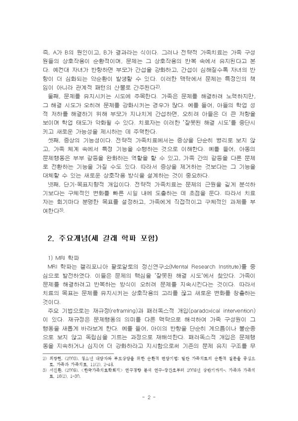 °¡Á·Ä¡·á´Â 20¼¼±â Áß¹Ý ÀÌÈÄ ½É¸®Ä¡·áÀÇ »õ·Î¿î È帧À¸·Î ÀÚ¸® ÀâÀ¸¸é¼, °³ÀÎÀÇ ¹®Á¦¸¦ ´ÜÁö °³ÀÎ ³»ºÎÀÇ ½É¸®Àû º´¸®·Î ±¹ÇÑÇÏÁö ¾Ê°í, °¡Á·À̶ó´Â »óÈ£ÀÛ¿ë ü°è ¼Ó¿¡¼ ÀÌÇØÇÏ·Á´Â ½Ãµµ¸¦ ÇØ¿Ô´Ù. ±× °¡¿îµ¥¼µµ Àü·«Àû °¡Á·Ä¡·á´Â ªÀº ½Ã°£ ¾È¿¡ ±¸Ã¼Àû º¯È¸¦ À̲ø¾î ³»´Â µ¥ ÁßÁ¡À» µÐ Á¢±ÙÀ¸·Î, Ä¡·áÀÚ°¡ ´Ü¼øÈ÷ °ø°¨Çϰųª ÇØ¼®À» Á¦°øÇÏ´Â °Í¿¡¼ ±×Ä¡Áö ¾Ê°í Àû±ØÀûÀ¸·Î °³ÀÔÇÏ¸ç º¯È¸¦ ¼³°èÇÑ´Ù´Â Á¡¿¡¼ Ư¡ÀûÀÌ´Ù. Àü·«Àû °¡Á·Ä¡·á´Â °³ÀÎÀÇ Áõ»óÀ» °¡Á·°ü°è ¾È¿¡¼ ÀçÁ¤ÀÇÇϰí, Áõ»óÀÌ °¡Áö´Â ±â´ÉÀû Ãø¸éÀ» ÆÄ¾ÇÇÏ¿© À̸¦ º¯È½ÃŰ´Â °úÁ¦¸¦ °¡Á·¿¡°Ô Á÷Á¢ÀûÀ¸·Î Á¦½ÃÇÑ´Ù. ´Ù½Ã ¸»ÇØ, ¹®Á¦ÇൿÀ» °³ÀÎÀÇ º´¸®Àû °á°ú·Î º¸´Â °ÍÀÌ ¾Æ´Ï¶ó, °¡Á·Ã¼°èÀÇ »óÈ£ÀÛ¿ë °úÁ¤ ¼Ó¿¡¼ Çü¼ºµÈ ¹Ýº¹Àû ÆÐÅÏÀÇ »ê¹°·Î °£ÁÖÇÑ´Ù. ÀÌ·¯ÇÑ °üÁ¡Àº ±âÁ¸ÀÇ Á¤½ÅºÐ¼®À̳ª Çൿġ·á¿Í´Â ´Ù¸¥ Â÷º°¼ºÀ» º¸ÀδÙ. Á¤½ÅºÐ¼®Àû Á¢±ÙÀÌ °³ÀÎÀÇ °ú°Å °æÇèÀ̳ª ¹«ÀǽÄÀû °¥µî¿¡ ÃµÂøÇß´Ù¸é, Àü·«Àû °¡Á·Ä¡·á´Â ÇöÀç °¡Á· ³»¿¡¼ ¹Ýº¹µÇ´Â »óÈ£ÀÛ¿ëÀÇ ±¸Á¶¿Í ÆÐÅÏ¿¡ ÁÖ¸ñÇϸç, À̸¦ º¯È½ÃÅ´À¸·Î½á ¹®Á¦¸¦ ÇØ°áÇÑ´Ù. ¶ÇÇÑ Çൿġ·á°¡ °³ÀÎÀÇ Çൿ ¼öÁ¤¿¡ ÃÊÁ¡À» ¸ÂÃá µ¥ ¹ÝÇØ, Àü·«Àû °¡Á·Ä¡·á´Â °¡Á· ±¸¼º¿ø °£ÀÇ °ü°èÀû ¸Æ¶ôÀ» °Á¶ÇÏ¸é¼ ±× °ü°è ¼Ó¿¡¼ ³ªÅ¸³ª´Â Áõ»óÀÇ ±â´ÉÀ» ÀÌÇØÇÏ·Á ÇÑ´Ù. Àü·«Àû °¡Á·Ä¡·á´Â ÇϳªÀÇ ´ÜÀÏÇÑ ÇÐÆÄ¶ó±âº¸´Ù´Â ¿©·¯ ÇÐÀÚµéÀÇ ¿¬±¸°¡ ±³Â÷ÇÏ¸ç ¼¼ °¥·¡ È帧À¸·Î ¹ßÀüÇß´Ù. ´ëÇ¥ÀûÀÎ °ÍÀÌ MRI ÇÐÆÄ, ÇìÀϸ®¿Í ¸¶´Ù³×½º ÇÐÆÄ, ¹Ð¶ó³ë ÇÐÆÄÀÌ´Ù. MRI ÇÐÆÄ´Â À߸øµÈ ÇØ°á ½Ãµµ°¡ ¹®Á¦¸¦ À¯Áö½ÃŲ´Ù°í º¸¾ÒÀ¸¸ç, ÇìÀϸ®¿Í ¸¶´Ù³×½º ÇÐÆÄ´Â °¡Á· ³» ±Ç·Â ±¸Á¶¿Í À§°èÁú¼¸¦ °Á¶ÇÏ¿´´Ù. ¹Ý¸é ¹Ð¶ó³ë ÇÐÆÄ´Â °¡Á·ÀÌ °øÀ¯ÇÏ´Â ½Å³ä ü°è¿Í ´ã·ÐÀ» º¯ÈÀÇ ÇÙ½ÉÀ¸·Î º¸¾Ò´Ù. ÀÌ ±Û¿¡¼´Â ¼¼ ÇÐÆÄ°¡ °øÀ¯ÇÏ´Â ±âº» ¿ø¸®¿Í Â÷º°Àû Ư¡À» »ìÆìº¸°í, ½ÇÁ¦ ÀÓ»ó¿¡¼ »ç¿ëµÇ´Â ´ëÇ¥Àû ±â¹ýÀ» ±¸Ã¼ÀûÀ¸·Î ¼³¸íÇÔÀ¸·Î½á Àü·«Àû °¡Á·Ä¡·áÀÇ ÀÇÀǸ¦ ÀçÁ¶¸íÇϰíÀÚ ÇÑ´Ù. II. º» ·Ð 1. Àü·«Àû °¡Á·Ä¡·á ÀÌ·ÐÀÇ ±âº»¿ø¸® Àü·«Àû °¡Á·Ä¡·á´Â ¸î °¡Áö °øÅëÀûÀÎ ±âº» ¿ø¸®¸¦ ¹ÙÅÁÀ¸·Î Àü°³µÈ´Ù. ù°, ¼øÈ¯Àû Àΰú¼ºÀÌ´Ù. ÀüÅëÀû ½É¸®ÇÐÀº Á¾Á¾ ¼±ÇüÀû Àΰú°ü°è¸¦ ÀüÁ¦ÇÑ´Ù. Áï, A°¡ BÀÇ ¿øÀÎÀ̰í, B°¡ °á°ú¶ó´Â ½ÄÀÌ´Ù. ±×·¯³ª Àü·«Àû °¡Á·Ä¡·á´Â °¡Á· ±¸¼º¿øµéÀÇ »óÈ£ÀÛ¿ëÀÌ ¼øÈ¯ÀûÀ̸ç, ¹®Á¦´Â ±× »óÈ£ÀÛ¿ëÀÇ ¹Ýº¹ ¼Ó¿¡¼ À¯ÁöµÈ´Ù°í º»´Ù. ¿¹ÄÁ´ë Àڳడ ¹ÝÇ×ÇÏ¸é ºÎ¸ð°¡ °£¼·À» °ÈÇϰí, °£¼·ÀÌ ½ÉÇØÁú¼ö·Ï ÀÚ³àÀÇ ¹ÝÇ×ÀÌ ´õ ½ÉȵǴ ¾Ç¼øÈ¯ÀÌ ¹ß»ýÇÒ ¼ö ÀÖ´Ù. ÀÌ·¯ÇÑ ¸Æ¶ô¿¡¼ ¹®Á¦´Â ƯÁ¤ÀÎÀÇ Ã¥ÀÓÀÌ ¾Æ´Ï¶ó °ü°èÀû ÆÐÅÏÀÇ »ê¹°·Î °£ÁֵȴÙ. µÑ°, ¹®Á¦¸¦ À¯Áö½ÃŰ´Â ½Ãµµ¿¡ ÁÖ¸ñÇÑ´Ù. °¡Á·Àº ¹®Á¦¸¦ ÇØ°áÇÏ·Á ³ë·ÂÇÏÁö¸¸, ±× ÇØ°á ½Ãµµ°¡ ¿ÀÈ÷·Á ¹®Á¦¸¦ °È½ÃŰ´Â °æ¿ì°¡ ¸¹´Ù. ¿¹¸¦ µé¾î, ¾ÆµéÀÇ Çо÷ ¼ºÀû ÀúÇϸ¦ ÇØ°áÇϱâ À§ÇØ ºÎ¸ð°¡ Áö³ªÄ¡°Ô °£¼·Çϸé, ¿ÀÈ÷·Á ¾ÆµéÀº ´õ Å« ÀúÇ×À» º¸À̸ç Çо÷ ŵµ°¡ ¾Ç鵃 ¼ö ÀÖ´Ù. Ä¡·áÀÚ´Â ÀÌ·¯ÇÑ ¡®À߸øµÈ ÇØ°á ½Ãµµ¡¯¸¦ ÁߴܽÃŰ°í »õ·Î¿î °¡´É¼ºÀ» Á¦½ÃÇÏ´Â µ¥ ÁÖ·ÂÇÑ´Ù. ¼Â°, Áõ»óÀÇ ±â´É¼ºÀÌ´Ù. Àü·«Àû °¡Á·Ä¡·á¿¡¼´Â Áõ»óÀ» ´Ü¼øÈ÷ º´¸®·Î º¸Áö ¾Ê°í, °¡Á· ü°è ¼Ó¿¡¼ ƯÁ¤ ±â´ÉÀ» ¼öÇàÇÏ´Â °ÍÀ¸·Î ÀÌÇØÇÑ´Ù. ¿¹¸¦ µé¾î, ¾Æµ¿ÀÇ ¹®Á¦ÇൿÀº ºÎºÎ °¥µîÀ» ¿ÏÈÇÏ´Â ¿ªÇÒÀ» ÇÒ ¼ö ÀÖ°í, °¡Á· °£ÀÇ °¥µîÀ» ´Ù¸¥ ¹®Á¦·Î ÀüȯÇÏ´Â ±â´ÉÀ» °¡Áú ¼öµµ ÀÖ´Ù. µû¶ó¼ Áõ»óÀ» Á¦°ÅÇÏ´Â °Íº¸´Ù´Â ±× ±â´ÉÀ» ´ëüÇÒ ¼ö ÀÖ´Â »õ·Î¿î »óÈ£ÀÛ¿ë ¹æ½ÄÀ» ¼³°èÇÏ´Â °ÍÀÌ Áß¿äÇÏ´Ù. ³Ý°, ´Ü±â¡¤¸ñÇ¥ÁöÇâÀû °³ÀÔÀÌ´Ù. Àü·«Àû °¡Á·Ä¡·á´Â ¹®Á¦ÀÇ ±Ù¿øÀ» ±æ°Ô ºÐ¼®Çϱ⺸´Ù´Â ±¸Ã¼ÀûÀÎ º¯È¸¦ ºü¸¥ ½ÃÀÏ ³»¿¡ µµÃâÇÏ´Â µ¥ ÃÊÁ¡À» µÐ´Ù. µû¶ó¼ Ä¡·áÀڴ ȸ±â¸¶´Ù ºÐ¸íÇÑ ¸ñÇ¥¸¦ ¼³Á¤Çϰí, °¡Á·¿¡°Ô Á÷Á¢ÀûÀÌ°í ±¸Ã¼ÀûÀÎ °úÁ¦¸¦ ºÎ¿©ÇÑ´Ù. 2. ÁÖ¿ä°³³ä(¼¼ °¥·¡ ÇÐÆÄ Æ÷ÇÔ) 1) MRI ÇÐÆÄ MRI ÇÐÆÄ´Â Ä¶¸®Æ÷´Ï¾Æ ÆÈ·Î¾ËÅäÀÇ Á¤½Å¿¬±¸¼Ò(Mental Research Institute)¸¦ Áß½ÉÀ¸·Î ¹ßÀüÇÏ¿´´Ù. À̵éÀº ¹®Á¦ÀÇ ÇÙ½ÉÀ» ¡®À߸øµÈ ÇØ°á ½Ãµµ¡¯¿¡¼ ã¾Ò´Ù. °¡Á·ÀÌ ¹®Á¦¸¦ ÇØ°áÇÏ·Á°í ¹Ýº¹ÇÏ´Â ¹æ½ÄÀÌ ¿ÀÈ÷·Á ¹®Á¦¸¦ Áö¼Ó½ÃŲ´Ù´Â °Í