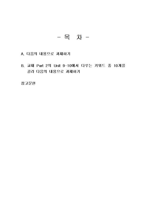 A. ´ÙÀ½ÀÇ ³»¿ëÀ¸·Î °úÁ¦Çϱâ 1. ±³Àç Unit 1°ú ¸ÖƼ°ÀÇ 1, 2°¿¡¼ ´ÙÀ½ Ç¥ÇöÀÌ »ç¿ëµÈ ¹®ÀåÀ» ã¾Æ Àû°í, ¹®ÀåÀ» ¿ì¸®¸»·Î ¹ø¿ªÇÑ´Ù. 2. ±³Àç Unit 1°ú ¸ÖƼ°ÀÇ 1, 2°¿¡¼ °ü°è´ë¸í»ç°¡ »ç¿ëµÈ ¹®ÀåÀ» ¸ðµÎ ã¾Æ Àû°í, °¢°¢ÀÇ ¹®Àå¿¡ ´ëÇØ ¹®¹ýÀûÀÎ ¼³¸íÀ» °çµéÀδÙ. 3. ±³Àç Unit 1°ú ¸ÖƼ°ÀÇ 1, 2°¿¡¼ to ºÎÁ¤»ç°¡ »ç¿ëµÈ ¹®ÀåÀ» ¸ðµÎ ã¾Æ Àû°í, °¢°¢ÀÇ ¹®Àå¿¡¼ to ºÎÁ¤»ç°¡ ¾î¶² ¿ªÇÒÀ» Çϰí ÀÖ´ÂÁö ¼³¸íÀ» °çµéÀδÙ. B. ±³Àç Part 2ÀÇ Unit 9-10¿¡¼ ´Ù·ç´Â Ű¿öµå Áß 10°³¸¦ °ñ¶ó ´ÙÀ½ÀÇ ³»¿ëÀ¸·Î °úÁ¦Çϱâ 1. ¼±ÅÃÇÑ 10°³ÀÇ °¢ Ű¿öµå¸¶´Ù Ű¿öµåÀÇ Á¤ÀÇ(definition)³ª ¼³¸íÀ» ±³Àç¿¡¼ ã¾Æ Àû°í ÇÑ±Û·Î ÇØ¼®Çϱâ 2. ¼±ÅÃÇÑ 10°³ÀÇ °¢ Ű¿öµå¿Í °ü·Ã, ±³Àç ¿ÜÀÇ ÀÚ·á(ÀÎÅÍ³Ý ´º½º³ª Á¤º¸»çÀÌÆ®, ȤÀº Àú¼. ´Ü ÀÎÅÍ³Ý »çÀüÀº Á¦¿Ü)¿¡¼ ¿µ¾î ¿¹¹® 2°³¸¦ ã¾Æ Àû°í ÇÑ±Û·Î ÇØ¼®ÇÒ °Í(¿¹¹®¿¡¼ ÇØ´ç Ű¿öµå¿¡ ¹Ýµå½Ã ¹ØÁÙÀ» ±ß°í ¿¹¹®ÀÇ Á¤È®ÇÑ Ãâó[ÀÎÅÍ³Ý ÁÖ¼Ò ¸µÅ© ȤÀº Àú¼¸í]¸¦ ÀûÀ» °Í) - ¸ñ Â÷ - A. ´ÙÀ½ÀÇ ³»¿ëÀ¸·Î °úÁ¦Çϱâ B. ±³Àç Part 2ÀÇ Unit 9-10¿¡¼ ´Ù·ç´Â Ű¿öµå Áß 10°³¸¦ °ñ¶ó ´ÙÀ½ÀÇ ³»¿ëÀ¸·Î °úÁ¦Çϱâ Âü°í¹®Çå ¢ºÀÚ·á³»¿ë ¹Ì¸®º¸±â