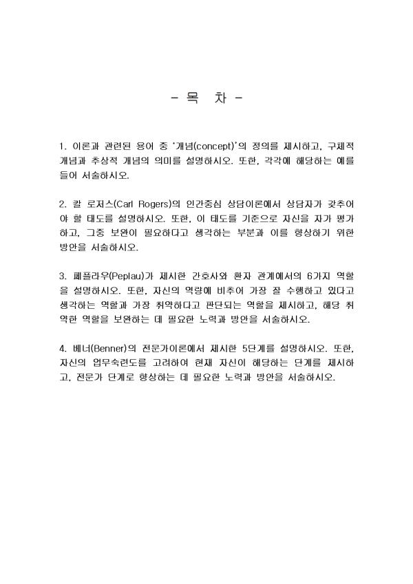 1. À̷аú °ü·ÃµÈ ¿ë¾î Áß ¡®°³³ä(concept)¡¯ÀÇ Á¤ÀǸ¦ Á¦½ÃÇϰí, ±¸Ã¼Àû °³³ä°ú Ãß»óÀû °³³äÀÇ Àǹ̸¦ ¼³¸íÇϽÿÀ. ¶ÇÇÑ, °¢°¢¿¡ ÇØ´çÇÏ´Â ¿¹¸¦ µé¾î ¼¼úÇϽÿÀ. 2. Ä® ·ÎÀú½º(Carl Rogers)ÀÇ Àΰ£Á᫐ »ó´ãÀ̷п¡¼ »ó´ãÀÚ°¡ °®Ãß¾î¾ß ÇÒ Åµµ¸¦ ¼³¸íÇϽÿÀ. ¶ÇÇÑ, ÀÌ Åµµ¸¦ ±âÁØÀ¸·Î ÀÚ½ÅÀ» ÀÚ°¡ Æò°¡Çϰí, ±×Áß º¸¿ÏÀÌ ÇÊ¿äÇÏ´Ù°í »ý°¢ÇÏ´Â ºÎºÐ°ú À̸¦ Çâ»óÇϱâ À§ÇÑ ¹æ¾ÈÀ» ¼¼úÇϽÿÀ. 3. ÆäÇöó¿ì(Peplau)°¡ Á¦½ÃÇÑ °£È£»ç¿Í ȯÀÚ °ü°è¿¡¼ÀÇ 6°¡Áö ¿ªÇÒÀ» ¼³¸íÇϽÿÀ. ¶ÇÇÑ, ÀÚ½ÅÀÇ ¿ª·®¿¡ ºñÃß¾î °¡Àå Àß ¼öÇàÇϰí ÀÖ´Ù°í »ý°¢ÇÏ´Â ¿ªÇÒ°ú °¡Àå Ãë¾àÇÏ´Ù°í ÆÇ´ÜµÇ´Â ¿ªÇÒÀ» Á¦½ÃÇϰí, ÇØ´ç Ãë¾àÇÑ ¿ªÇÒÀ» º¸¿ÏÇÏ´Â µ¥ ÇÊ¿äÇÑ ³ë·Â°ú ¹æ¾ÈÀ» ¼¼úÇϽÿÀ. 4. º£³Ê(Benner)ÀÇ Àü¹®°¡À̷п¡¼ Á¦½ÃÇÑ 5´Ü°è¸¦ ¼³¸íÇϽÿÀ. ¶ÇÇÑ, ÀÚ½ÅÀÇ ¾÷¹«¼÷·Ãµµ¸¦ °í·ÁÇÏ¿© ÇöÀç ÀÚ½ÅÀÌ ÇØ´çÇÏ´Â ´Ü°è¸¦ Á¦½ÃÇϰí, Àü¹®°¡ ´Ü°è·Î Çâ»óÇÏ´Â µ¥ ÇÊ¿äÇÑ ³ë·Â°ú ¹æ¾ÈÀ» ¼¼úÇϽÿÀ. ** ÇÔ²² Á¦°øµÇ´Â Âü°íÀÚ·áÆÄÀÏ ** 1. °³³äÀÇÁ¤ÀÇ.hwp 2. °³³äÀÇÁ¤ÀÇ2.hwp 3. °³³äÀÇÁ¤ÀÇ3.hwp 4. ±¸Ã¼Àû°³³ä°úÃß»óÀû°³³ä.hwp 5. ±¸Ã¼Àû°³³ä°úÃß»óÀû°³³ä2.hwp 6. ³ªÀÇ °£È£»ç ´Ü°è¿¡ ´ëÇÑ Æò°¡.hwp 7. ³ªÀÇ °£È£»ç ´Ü°è¿¡ ´ëÇÑ Æò°¡2.hwp 8. ³ªÀÇ °£È£»ç ¿ªÇÒº¸¿Ï°ú ³ë·Â¹æ¾È.hwp 9. ³ªÀÇ °£È£»ç ¿ªÇÒº¸¿Ï°ú ³ë·Â¹æ¾È2.hwp 10.³»¿ª·®¿¡ ºñÃß¾î º» °£È£»çÀÇ ¿ªÇÒ.hwp 11.º£³ÊÀÇ °£È£ Àü¹®¼º ¹ß´Þ 5´Ü°è.hwp 12.³ªÀÇ °£È£»ç·Î¼ º¸¿ÏÁ¡°ú Çâ»óÀ» À§ÇÑ ¹æ¾È.hwp 13.³ªÀÇ °£È£»ç·Î¼ º¸¿ÏÁ¡°ú Çâ»óÀ» À§ÇÑ ¹æ¾È2.hwp 14.Ä®·ÎÀú½º Àΰ£Á᫐ »ó´ãÀ̷п¡¼ »ó´ãÀÚ°¡ °®Ãß¾î¾ß ÇÒ Åµµ.hwp 15.ŵµ¸¦ ±âÁØÀ¸·Î ÇÑ ³ªÀÇ Æò°¡.hwp 16.ŵµ¸¦ ±âÁØÀ¸·Î ÇÑ ³ªÀÇ Æò°¡2.hwp 17. ÆäÇöó¿ì°¡ Á¦½ÃÇÑ °£È£»çÀÇ 6°¡Áö ¿ªÇÒ.hwp ¢ºÀÚ·á³»¿ë ¹Ì¸®º¸±â