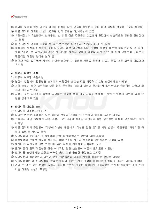 1. ¿©·ÎÇü ¼Ò¼³ÀÇ °³³ä 1) °³³ä ¨ç ¿ì¸®ÀÇ »îÀ» ±×¸®´Â ¼Ò¼³Àº ±æ¿¡ ºñÀ¯µÉ ¼ö ÀÖÀ½ ¨è ·çīġ´Â ¼Ò¼³ÀÌ ¡®»îÀÇ °úÁ¤¡¯À» ´ã´Â ¾ç½ÄÀ̶ó°í ¸»ÇÏ¸ç ±× ÁøÇàÀ» ¿©·Î¿¡ ºñÀ¯ÇßÀ½ ¨é ¼Ò¼³À̶õ ÁÖÀΰøÀÌ ÀÚ½ÅÀÇ ¿µÈ¥À» ã¾Æ ±æÀ» ¶°³ª´Â À̾߱âÀÓ ¨ê ¼Ò¼³ÀÇ ¿©·Î¿¡¼ ¿µÈ¥À» ã´Â ¸ðÇèÀº ÇÑ ÆíÀÇ ¼Ò¼³ ¼Ó¿¡ ½±°Ô ´ã¾ÆÁöÁö ¾ÊÀ½ ¨ë Çö½ÇÀÇ ÆÐ¹è¿Í ³»¸éÀÇ ½Â¸®¶ó´Â ¾ÆÀÌ·¯´Ï´Â ·çīġ°¡ ¸»ÇÑ ¿©·ÎÀÇ Áß¿äÇÑ ¿ä¼Ò·Î º¼ ¼ö ÀÖÀ½ ¨ì ¸®¾ó¸®Áò ¼Ò¼³Àº ´ëºÎºÐ Àι°°ú ȯ°æÀÇ ±³¼·À¸·Î ³ªÅ¸³ª´Â ¡®»îÀÇ ±æ¡¯À̶ó´Â ÀºÀ¯ÀûÀÎ ¿©·Î¸¦ º¸¿© ÁÜ ¨í º»°Ý ¸®¾ó¸®ÁòÀÇ ¿ªµ¿Àû Ç÷ÔÀº Àι°°ú ȯ°æÀÇ °ü°è°¡ ¿Õ¼ºÇÒ ¶§ °¡´ÉÇϸç À̶§ÀÇ ¡®»ýȰÀÇ ±æ¡¯Àº ºñÀ¯ÀûÀÎ ¿©·ÎÀÓ ¨î »ýȰÀÇ ¿©·Î°¡ ÁöÁöºÎÁøÇÒ ¶§ ÁÖÀΰøÀÌ °Å¸®¸¦ °È°Å³ª ¿©Çà±æ¿¡ ¿À¸£´Â ÀÌ·± ¾ç½ÄÀ» ¿©·ÎÇü ¼Ò¼³À̶ó°í ºÎ¸§ ¨ï ¿©·ÎÇü ¼Ò¼³Àº º»°Ý ¸®¾ó¸®Áò À̿ܿ¡ ´Ù¾çÇÑ À¯ÇüÀÇ ¼Ò¼³ ¾ç½ÄµéÀÇ Æ¯Â¡À» º¸¿© ÁÜ 2. ¿©·ÎÇü ¼Ò¼³ÀÇ ´Ù¾çÇÑ ¾ç½Ä 1) ´Ù¾çÇÑ ¾ç½Ä ¨ç ¿©·ÎÇü ¼Ò¼³Àº ¼Ò¼³»çÀÇ Ãʱ⿡¼ºÎÅÍ ¿À´Ã³¯±îÁö ³¡¾øÀÌ °è¼Ó ³ªÅ¸³ª°í ÀÖÀ½ ¨è ¿ª»çÀû º¯È ¼Ó¿¡¼ ´Ù¾çÇÏ°Ô ÃâÇöÇÏ´Â ¿©·ÎÇü ¼Ò¼³ÀÇ °øÅëÁ¡Àº Àι°°ú ȯ°æÀÇ ±³¼·ÀÌ ¿øÈ°ÇÏÁö ¾Ê´Ù´Â °ÍÀÓ ¨é ¿©·ÎÇü ¼Ò¼³Àº ÈçÈ÷ Àι°°ú ȯ°æÀÇ ±«¸® ¼Ó¿¡¼ »ýȰÀÎÀÌ µÇÁö ¸øÇÏ°í ±æÀ» ³ª¼´Â °úÁ¤À¸·Î ±×·ÁÁü ¨ê ´Ù¾çÇÑ ¿©·ÎÇü ¼Ò¼³¿¡¼ ÁÖÀΰøÀÌ ±æÀ» ³ª¼´Â µ¿±â³ª °úÁ¤Àº ¶È°°Áö ¾ÊÀ½ ¨ë ÁÖÀΰøÀÇ ³»¸éÀÇ »óųª ¿©·ÎÀÇ ÁøÇà °úÁ¤¿¡ µû¶ó ¿©·ÎÇü ¼Ò¼³Àº ¿©·¯ °¡Áö ¾ç½ÄÀ¸·Î ±¸ºÐµÉ ¼ö ÀÖÀ½ ¨ì Áï ³»¸é °í¹éü ¼Ò¼³°ú ¼Á¤ ¼Ò¼³, ¸ð´õ´ÏÁò ¼Ò¼³£¬ Æ÷½ºÆ®¸ð´õ´ÏÁò ¼Ò¼³ÀÌ ÀÖÀ¸¸ç£¬ ¶ÇÇÑ À¯¶ûÀ» ÇÏ´Â ¹ÎÁßÀ» ±×¸®´Â ¸®¾ó¸®Áò ¿©·ÎÇü ¼Ò¼³µµ ÀÖÀ½ ¨í ¼Á¤Àû ¿©·ÎÇü ¼Ò¼³ ¿ª½Ã ÁÖÀΰøÀÇ ³»¸é°ú Çö½ÇÀÌ ±«¸®µÇ¾î ÀÖÀ» ¶§ ³ªÅ¸³² ¨î ¼Á¤ÀûÀÎ ¼Ò¼³Àº ÀÌ»óÀÇ °í¾çº¸´Ù´Â °¨¼ºÀûÀÎ ÈÇØÀÇ ¼Ò¸ÁÀ» Áö´Ñ ÁÖÀΰøÀÌ ±æÀ» °¡´Â ÁøÇàÀ» º¸ÀÓ ¨ï ¼Ò¼³ÀÌ Çö½Ç¿¡ ¿ïºÐÀ» ´À³¢¸ç ÀÌ»ó¿¡ ´ëÇÑ Ãæµ¿À¸·Î ±æÀ» ³ª¼´Â ¹Ý¸é£¬¸ð´õ´ÏÁò ¼Ò¼³¿¡¼´Â ´õ ÀÌ»ó ±â´ë°¨À» °®Áö ¾ÊÀº »óÅ¿¡¼ Çö½Ç¿¡ µ¿ÈµÇÁö ¾ÊÀ¸·Á´Â ŵµ·Î ¿©·Î¿¡ ³ª¼¶ ¨ð ¿©·ÎÇü ¼Ò¼³Àº ȯ°æ¿¡¼ ±«¸®°¨À» ´À³¢´Â Àι°µéÀÇ ¼Ò¼³À̱⠶§¹®¿¡ ¸®¾ó¸®Áò¿¡¼´Â Àß ³ªÅ¸³ªÁö ¾ÊÀ½ ¨ñ ÇöÁø°ÇÀÇ¡¸°íÇ⡹ (1926)£¬ ±è³²ÃµÀÇ¡¸Ã¶·É±îÁö¡¹ (1938)£¬ Ȳ¼®¿µÀÇ¡¸»ïÆ÷ °¡´Â ±æ¡¹Àº ´ëÇ¥ÀûÀÎ ¿©·ÎÇü À¯¶û¼Ò¼³ÀÓ ¨ò ¸¶Áö¸·À¸·Î °¡Àå ½ÇÇèÀûÀÎ ¼Ò¼³·Î Çö½Ç¿¡¼ Å»ÁÖ¸¦ ½ÃµµÇÏ´Â Æ÷½ºÆ®¸ð´õ´ÏÁò ¿©·ÎÇü ¼Ò¼³ÀÌ ÀÖÀ½ 3. ³»¸é °í¹éü ¿©·ÎÇü ¼Ò¼³ 1) ³»¸é °í¹éü ¨ç ³»¸é °í¹éü ¿©·ÎÇü ¼Ò¼³Àº ÀÌ»ó°ú Çö½ÇÀÇ ±«¸®°¡ ±Ø½ÉÇÒ ¶§ ³ªÅ¸³² ¨è ÀÌ À¯ÇüÀÇ ÁÖÀΰøµéÀº Áø¸®ÀÇ ½ÅºÀÀÚÀÌÁö¸¸ ±×¿Í »ó¹ÝµÇ´Â Çö½ÇÀ» °æÇèÇϸç Á¤½ÅÀûÀÎ °íÅëÀ» È£¼ÒÇÏ´Â °æ¿ì°¡ ¸¹À½ ¨é ȯ¸êÀÇ Åä·Î¸¦ ÅëÇØ ¿ªÀ¸·Î ³»¸é¿¡ ÀÌ»óÀÌ ³²¾Æ ÀÖÀ½À» Áõ¸íÇÏ´Â °ÍÀÌ ³»¸é °í¹éü ¿©·ÎÇü ¼Ò¼³ÀÇ Æ¯Â¡ÀÓ ¨ê ³»¸é °í¹éü ¿©·ÎÇü ¼Ò¼³ÀÇ º¯ÁÖµÈ Çü½Ä Áß¿¡´Â¡¸¸¸¼¼Àü¡¹ÀÌ ÀÖÀ½ ¨ë ¡¸¸¸¼¼Àü¡¹ÀÌ¡¸Ç¥º»½ÇÀÇ Ã»°³±¸¸®¡¹¿Í ´Ù¸¥ Á¡Àº ÁÖÀΰøÀÌ ¿©·Î¿¡¼ ȯ°æ°úÀÇ »óÈ£ÀÛ¿ëÀ» ¾ó¸¶°£ °æÇèÇÑ´Ù´Â Á¡ÀÓ ¨ì ³»¸é °í¹éü ¿©·ÎÇü ¼Ò¼³ÀÇ ¶Ç ´Ù¸¥ º¯Áַδ ÃÖÀÎÈÆÀÇ ¡º±¤Àå¡»À» µé ¼ö ÀÖÀ½ ¨í ±¤Àå¿¡¼ »çº¯ÀûÀÎ ¹Ý¼ºÀÌ ¸¹ÀÌ ³ªÅ¸³ª´Â Á¡Àº ¿°»ó¼·ÀÇ ³»¸é °í¹éü ¾ç½Ä°ú ºñ½ÁÇÑ Æ¯Â¡À¸·Î º¼ ¼ö ÀÖ´Ù. ¶ÇÇÑ¡º±¤Àå¡»Àº ÁÖÀΰø£¨À̸íÁØ£©ÀÌ ´ä´äÇÑ ¹æ¿¡¼ Å»ÃâÇØ ¿ùºÏÀ» Çϰí 6¡¤25 ¶§ ´Ù½Ã ³²ÇÑÀ¸·Î ³»·Á¿À´Â ºÎºÐÀûÀÎ ¿©·ÎÇü Çü½ÄÀ» º¸¿© ÁÜ ¨î ³²ÇѰú ºÏÇÑ ¸ðµÎ¿¡¼ ÀÚ½ÅÀÇ ÀÌ»óÀ» ½ÇÇöÇÒ ¼ö ¾øÀ½À» ±ú´Ý°í ȯ¸ê¿¡ À̸£´Â Á¡µµ ³»¸é °í¹éü ¿©·ÎÇü°ú À¯»çÇÔ 4. ¼Á¤Àû ¿©·ÎÇü ¼Ò¼³ 1) ¼Á¤Àû ¿©·ÎÇü ¼Ò¼³À̶õ ¨ç Çö½ÇÀÇ »ýȰ¿¡¼ ´ä´äÇÔÀ» ´À³¢´Ù°¡ ¿©Çà±æ¿¡ ¿À¸£´Â °ÍÀº ¼Á¤Àû ¿©·ÎÇü ¼Ò¼³¿¡¼µµ ³ªÅ¸³² ¨è ¼Á¤ ¼Ò¼³ÀÌ ³»¸é °í¹éü¿Í ´Ù¸¥ Á¡Àº ÁÖÀΰøÀÇ ÀÌ»óÀÌ À̼º¿¡ ±Ù°ÅÇÑ ¼¼°è°¡ ¾Æ´Ï¶ó °¨¼ºÀûÀÎ »ç¶û°ú ÈÇØÀÇ ¼ºÃë¶ó´Â Á¡ÀÓ ¨é ¼Á¤ ¼Ò¼³Àº ÀÚ¿¬°úÀÇ µ¿È¸¦ °¥¸ÁÇÏ´Â ¿©·Î¸¦ ÅëÇØ ¾ÆÁ÷ »ç¶û°ú ÈÇØ¸¦ ¼Ò¸ÁÇÏ´Â ¿µÈ¥ÀÌ ³»¸é¿¡ ³²¾Æ ÀÖÀ½À» ÀÔÁõÇϰí ÀÖÀ½ 5. ¸ð´õ´ÏÁò 