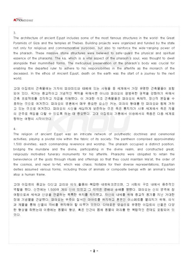 1. Ancient Egypt was an impressive civilization that arose around 3100 B.C.E. It remained a major power in North Africa and nearby regions until the Macedonians took over in 332 B.C.E. The civilization thrived mostly because it made the most of the Nile River¡¯s flood patterns for farming. The predictable flooding and con-trolled irrigation of the fertile valley produced surplus crops, which allowed the population to grow and society to become more complex. By successfully man-aging their environment and resources, the Egyptians established a culture rich in art, knowledge, and architecture that would influence the world for centuries to come. °í´ë ÀÌÁýÆ®´Â ±â¿øÀü 3100³â°æ¿¡ ÀÏ¾î³ ÀλóÀûÀÎ ¹®¸íÀ̾ú´Ù. ±â¿øÀü 332³â¿¡ ¸¶Äɵµ´Ï¾ÆÀεéÀÌ Àå¾ÇÇÒ ¶§±îÁö °í´ë ÀÌÁýÆ®´Â ºÏ¾ÆÇÁ¸®Ä«¿Í Àα٠Áö¿ªÀÇ ÁÖ¿ä °±¹À¸·Î ³²¾Æ ÀÖ¾ú´Ù. ÀÌ ¹®¸íÀº ÁÖ·Î ³ªÀϰÀÇ È«¼ö ÆÐÅÏÀ» ³ó¾÷¿¡ ÃÖ´ëÇÑ È°¿ëÇ߱⠶§¹®¿¡ ¹ø¼ºÇß´Ù. ¿¹Ãø °¡´ÉÇÑ È«¼ö¿Í ºñ¿ÁÇÑ °è°îÀÇ ÅëÁ¦µÈ °ü°³·Î ÀÎÇØ À׿© ³óÀÛ¹°ÀÌ »ý»êµÇ¾ú°í, ÀÌ·Î ÀÎÇØ Àα¸°¡ Áõ°¡ÇÏ°í »çȸ´Â ´õ¿í º¹ÀâÇØÁú ¼ö ÀÖ¾ú´Ù. ÀÌÁýÆ®ÀεéÀº ȯ°æ°ú ÀÚ¿øÀ» ¼º°øÀûÀ¸·Î °ü¸®ÇÔÀ¸·Î½á ¿¹¼ú, Áö½Ä, ±×¸®°í °ÇÃà¿¡¼ dz¼ºÇÑ ¹®È¸¦ È®¸³ÇßÀ¸¸ç ÀÌ´Â ÀÌÈÄ ¼ö ¼¼±â µ¿¾È ¼¼°è¿¡ ¿µÇâÀ» ¹ÌÄ¡°Ô µÇ¾ú´Ù. - Áß·« - [ 2Àå ÃâÁ¦¿¹»ó¹®Á¦]> ¹®Á¦ 1. ´ÙÀ½ ¹®Àå¿¡¼ (A)¿¡ µé¾î°¥ °¡Àå ÀûÀýÇÑ ´Ü¾î´Â? The civilization thrived mostly because it made the most of the Nile River's flood patterns for farming. The predictable flooding and controlled irrigation of the fertile valley produced surplus crops, which allowed the population to grow and society to become more complex. By successfully (A) their environment and resources, the Egyptians established a culture rich in art, knowledge, and architecture. ¨ç ignoring ¨è managing ¨é destroying ¨ê avoiding <ÇØ¼®> ÀÌ ¹®¸íÀº ÁÖ·Î ³ªÀϰÀÇ È«¼ö ÆÐÅÏÀ» ³ó¾÷¿¡ ÃÖ´ëÇÑ È°¿ëÇ߱⠶§¹®¿¡ ¹ø¼ºÇß´Ù. ¿¹Ãø °¡´ÉÇÑ È«¼ö¿Í ºñ¿ÁÇÑ °è°îÀÇ ÅëÁ¦µÈ °ü°³·Î ÀÎÇØ À׿© ³óÀÛ¹°ÀÌ »ý»êµÇ¾ú°í, ÀÌ·Î ÀÎÇØ Àα¸°¡ Áõ°¡ÇÏ°í »çȸ´Â ´õ¿í º¹ÀâÇØÁú ¼ö ÀÖ¾ú´Ù. ÀÌÁýÆ®ÀεéÀº ȯ°æ°ú ÀÚ¿øÀ» ¼º°øÀûÀ¸·Î (A)ÇÔÀ¸·Î½á ¿¹¼ú, Áö½Ä, ±×¸®°í °ÇÃà¿¡¼ dz¼ºÇÑ ¹®È¸¦ È®¸³Çß´Ù. <Á¤´ä> ¨è <ÇØ¼³> managingÀº '°ü¸®ÇÏ´Ù'¶ó´Â Àǹ̷Î, ÀÌÁýÆ®ÀεéÀÌ È¯°æ°ú ÀÚ¿øÀ» È¿°úÀûÀ¸·Î °ü¸®ÇÏ¿© ¹ø¿µÇÏ´Â ¹®¸íÀ» ÀÌ·èÇß´Ù´Â ³»¿ëÀÌ´Ù. ³ªÀϰÀÇ È«¼ö¸¦ ¿¹ÃøÇÏ°í °ü°³ ½Ã½ºÅÛÀ» ÅëÁ¦ÇÏ¿© ³ó¾÷ »ý»ê¼ºÀ» ³ôÀÎ °ÍÀÌ ´ëÇ¥ÀûÀÎ ¿¹ÀÌ´Ù. ignoringÀº '¹«½ÃÇÏ´Ù', destroyingÀº 'ÆÄ±«ÇÏ´Ù', avoidingÀº 'ÇÇÇÏ´Ù'·Î ¹®¸Æ»ó ÀûÀýÇÏÁö ¾Ê´Ù. °í´ë ÀÌÁýÆ® ¹®¸íÀÌ ¿À·§µ¿¾È ¹ø¼ºÇÒ ¼ö ÀÖ¾ú´ø °ÍÀº ÀÚ¿¬È¯°æÀ» Àß °ü¸®Çϰí Ȱ¿ëÇ߱⠶§¹®À̶ó´Â Á¡¿¡¼ managingÀÌ Á¤´äÀÌ´Ù. - Áß·« - |