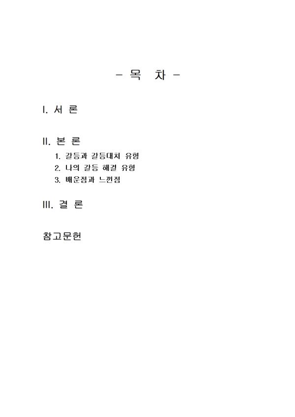 °ÀÇ ¹× ±³Àç 13° ¡°³ªÀÇ °¥µî ½ºÅ¸ÀÏ¡±ÀÇ ³»¿ëÀ» ¹ÙÅÁÀ¸·Î °¥µî°ú °¥µî´ëó À¯Çü¿¡ ´ëÇØ ÇмúÀûÀ¸·Î Á¤¸®ÇÑ ÈÄ, ³ªÀÇ »î¿¡¼ °æÇèÇß´ø ´ëÀΰü°è °¥µîÀ» ¹ÙÅÁÀ¸·Î ³ªÀÇ °¥µî ÇØ°á À¯ÇüÀ» ºÐ¼®Çϰí, ÀÌ·¯ÇÑ ºÐ¼® °úÁ¤¿¡¼ ¹è¿îÁ¡°ú ´À³¤Á¡À» ±â¼úÇϽÿÀ.