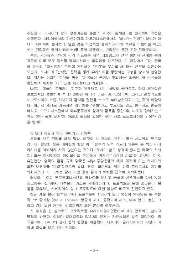 ƯÈ÷, ½ÃÁøÇΰú ǪƾÀÌ °¢°¢ ÁÖµµÇÏ´Â Áö¿ª ³×Æ®¿öÅ©¿Í Àü·« µ¿¹ÝÀÚ °ü°è¸¦ ÅëÇØ ±âÁ¸ÀÇ ¹Ì±¹ ÁÖµµ Áú¼­¸¦ ºØ±«½ÃŰ·Á´Â ¿òÁ÷ÀÓÀ» °­Á¶ÇÑ´Ù. ÀÌ °úÁ¤¿¡¼­ ±×´Â Áß±¹ÀÌ ¹Ì±¹ÀÇ ¡°ÆÐ±ÇÀ¯Áö¡± Á¤Ã¥¿¡ ÀúÇ×ÇÏ¸ç ¡®¹«¿ª¡¯À» ¹«±â·Î »õ ÆÐ±Ç Àü·«À» ½ÇõÇÏ´Â ¸ð½À°ú, ·¯½Ã¾Æ°¡ ¡®¹Ý½Ä¹Î¡¯ Àü·«À» ÅëÇØ À¯¶ó½Ã¾Æ¸¦ ÅëÇÕÇÏ´Â ±¸»óÀ» »ó¼¼È÷ ¼³¸íÇÑ´Ù. ÀúÀÚ´Â ÀÌ·¯ÇÑ ÁÖÀåÀ» ÅëÇØ, ¡®Á¦±¹µéÀÌ Áװųª ÈÄÅðÇϴ¡¯ ¿ÍÁß¿¡ »õ °­±¹µéÀÌ µîÀåÇÏ¸ç ¼¼°è´Â ¡®´Ù±Ø¡¯À¸·Î ÀçÆíµÈ´Ù°í ¿ª¼³ÇÑ´Ù.