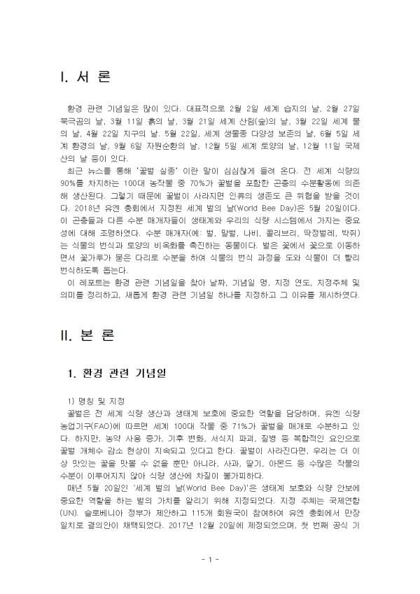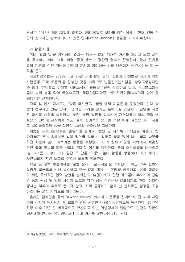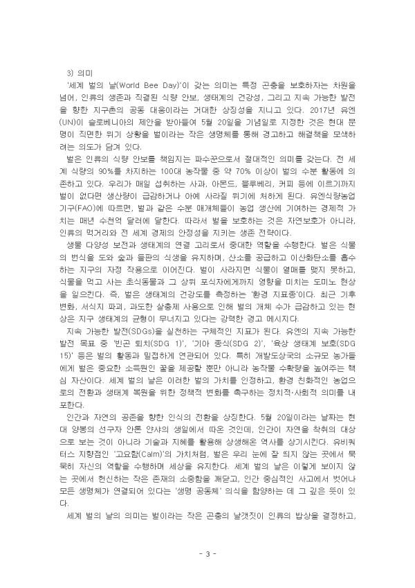 ȯ°æ °ü·Ã ±â³äÀÏÀº ¸¹ÀÌ ÀÖ´Ù. ´ëÇ¥ÀûÀ¸·Î 2¿ù 2ÀÏ ¼¼°è ½ÀÁöÀÇ ³¯, 2¿ù 27ÀÏ ºÏ±Ø°õÀÇ ³¯, 3¿ù 11ÀÏ ÈëÀÇ ³¯, 3¿ù 21ÀÏ ¼¼°è »ê¸²(½£)ÀÇ ³¯, 3¿ù 22ÀÏ ¼¼°è ¹°ÀÇ ³¯, 4¿ù 22ÀÏ Áö±¸ÀÇ ³¯. 5¿ù 22ÀÏ, ¼¼°è »ý¹°Á¾ ´Ù¾ç¼º º¸Á¸ÀÇ ³¯, 6¿ù 5ÀÏ ¼¼°è ȯ°æÀÇ ³¯, 9¿ù 6ÀÏ ÀÚ¿ø¼øÈ¯ÀÇ ³¯, 12¿ù 5ÀÏ ¼¼°è Åä¾çÀÇ ³¯, 12¿ù 11ÀÏ ±¹Á¦ »êÀÇ ³¯ µîÀÌ ÀÖ´Ù. ÃÖ±Ù ´º½º¸¦ ÅëÇØ ¡®²Ü¹ú ½ÇÁ¾¡¯ À̶õ ¸»ÀÌ ½É½ÉÂú°Ô µé·Á ¿Â´Ù. Àü ¼¼°è ½Ä·®ÀÇ 90%¸¦ Â÷ÁöÇÏ´Â 100´ë ³óÀÛ¹° Áß 70%°¡ ²Ü¹úÀ» Æ÷ÇÔÇÑ °ïÃæÀÇ ¼öºÐȰµ¿¿¡ ÀÇÁ¸ÇØ »ý»êµÈ´Ù. ±×·¸±â ¶§¹®¿¡ ²Ü¹úÀÌ »ç¶óÁö¸é ÀηùÀÇ »ýÁ¸µµ Å« À§ÇùÀ» ¹ÞÀ» °ÍÀÌ´Ù. 2018³â À¯¿£ ÃÑȸ¿¡¼ ÁöÁ¤µÈ ¼¼°è ¹úÀÇ ³¯(World Bee Day)Àº 5¿ù 20ÀÏÀÌ´Ù. ÀÌ °ïÃæµé°ú ´Ù¸¥ ¼öºÐ ¸Å°³ÀÚµéÀÌ »ýŰè¿Í ¿ì¸®ÀÇ ½Ä·® ½Ã½ºÅÛ¿¡¼ °¡Áö´Â Á߿伺¿¡ ´ëÇØ Á¶¸íÇÏ¿´´Ù. ¼öºÐ ¸Å°³ÀÚ(¿¹: ¹ú, ¸»¹ú, ³ªºñ, Äݸ®ºê¸®, µüÁ¤¹ú·¹, ¹ÚÁã)´Â ½Ä¹°ÀÇ ¹ø½Ä°ú Åä¾çÀÇ ºñ¿Áȸ¦ ÃËÁøÇÏ´Â µ¿¹°ÀÌ´Ù. ¹úÀº ²É¿¡¼ ²ÉÀ¸·Î À̵¿ÇÏ¸é¼ ²É°¡·ç°¡ ¹¯Àº ´Ù¸®·Î ¼öºÐÀ» ÇÏ¿© ½Ä¹°ÀÇ ¹ø½Ä °úÁ¤À» µµ¿Í ½Ä¹°ÀÌ ´õ »¡¸® ¹ø½ÄÇϵµ·Ï µ½´Â´Ù. ÀÌ ·¹Æ÷Æ®´Â ȯ°æ °ü·Ã ±â³äÀÏÀ» ã¾Æ ³¯Â¥, ±â³äÀÏ ¸í, ÁöÁ¤ ¿¬µµ, ÁöÁ¤ÁÖü ¹× Àǹ̸¦ Á¤¸®Çϰí, »õ·Ó°Ô ȯ°æ °ü·Ã ±â³äÀÏ Çϳª¸¦ ÁöÁ¤ÇÏ°í ±× ÀÌÀ¯¸¦ Á¦½ÃÇÏ¿´´Ù. II. º» ·Ð 1. ȯ°æ °ü·Ã ±â³äÀÏ 1) ¸íĪ ¹× ÁöÁ¤ ²Ü¹úÀº Àü ¼¼°è ½Ä·® »ý»ê°ú »ýÅÂ°è º¸È£¿¡ Áß¿äÇÑ ¿ªÇÒÀ» ´ã´çÇϸç, À¯¿£ ½Ä·®³ó¾÷±â±¸(FAO)¿¡ µû¸£¸é ¼¼°è 100´ë ÀÛ¹° Áß 71%°¡ ²Ü¹úÀ» ¸Å°³·Î ¼öºÐÇϰí ÀÖ´Ù. ÇÏÁö¸¸, ³ó¾à »ç¿ë Áõ°¡, ±âÈÄ º¯È, ¼½ÄÁö ÆÄ±«, Áúº´ µî º¹ÇÕÀûÀÎ ¿äÀÎÀ¸·Î ²Ü¹ú °³Ã¼¼ö °¨¼Ò Çö»óÀÌ Áö¼ÓµÇ°í ÀÖ´Ù°í ÇÑ´Ù. ²Ü¹úÀÌ »ç¶óÁø´Ù¸é, ¿ì¸®´Â ´õ ÀÌ»ó ¸ÀÀÖ´Â ²ÜÀ» ¸Àº¼ ¼ö ¾øÀ» »Ó¸¸ ¾Æ´Ï¶ó, »ç°ú, µþ±â, ¾Æ¸óµå µî ¼ö¸¹Àº ÀÛ¹°ÀÇ ¼öºÐÀÌ ÀÌ·ç¾îÁöÁö ¾Ê¾Æ ½Ä·® »ý»ê¿¡ Â÷ÁúÀÌ ºÒ°¡ÇÇÇÏ´Ù. ¸Å³â 5¿ù 20ÀÏÀÎ '¼¼°è ¹úÀÇ ³¯(World Bee Day)'Àº »ýÅÂ°è º¸È£¿Í ½Ä·® ¾Èº¸¿¡ Áß¿äÇÑ ¿ªÇÒÀ» ÇÏ´Â ¹úÀÇ °¡Ä¡¸¦ ¾Ë¸®±â À§ÇØ ÁöÁ¤µÇ¾ú´Ù. ÁöÁ¤ ÁÖü´Â ±¹Á¦¿¬ÇÕ(UN). ½½·Îº£´Ï¾Æ Á¤ºÎ°¡ Á¦¾ÈÇϰí 115°³ ȸ¿ø±¹ÀÌ Âü¿©ÇÏ¿© À¯¿£ ÃÑȸ¿¡¼ ¸¸ÀåÀÏÄ¡·Î °áÀǾÈÀÌ Ã¤ÅõǾú´Ù. 2017³â 12¿ù 20ÀÏ¿¡ Á¦Á¤µÇ¾úÀ¸¸ç, ù ¹øÂ° °ø½Ä ±â³ä½ÄÀº 2018³â 5¿ù 20ÀÏ¿¡ ¿·È´Ù. 5¿ù 20ÀÏ·Î ³¯Â¥¸¦ Á¤ÇÑ ÀÌÀ¯´Â Çö´ë ¾çºÀ »ê¾÷ÀÇ ¼±±¸ÀÚÀÎ ½½·Îº£´Ï¾ÆÀÇ ¾ÈÅæ ¾á»þ(Anton Janša)ÀÇ »ýÀÏÀ» ±â¸®±â À§ÇÔÀÌ´Ù. 2) Ȱµ¿ ³»¿ë '¼¼°è ¹úÀÇ ³¯'À» ±â³äÇÏ¿© ¿¸®´Â Çà»ç´Â ¹úÀÇ »ýÅÂÀû °¡Ä¡¸¦ ¾Ë¸®°í º¸È£ ½ÇõÀ» µ¶·ÁÇϱâ À§ÇØ ±³À°, üÇè, Á¤Ã¥ È«º¸°¡ °áÇÕµÈ ÇüÅ·ΠÁøÇàÇÑ´Ù. Çà»ç Àü¹ÝÀº ¹úÀÌ ÀηùÀÇ ½Ä·® ÀÚ¿ø°ú »ýŰè À¯Áö¿¡ ±â¿©ÇÏ´Â ¹Ù¸¦ ´ëÁß¿¡°Ô °¢ÀνÃŰ´Â µ¥ ¸ñÀûÀ» µÐ´Ù. ¼¿ïȯ°æ¿¬ÇÕÀº 2022³â 5¿ù 20ÀÏ ¼¼°è ¹úÀÇ ³¯¿¡ '²Ü¹ú°ú ¾ß»ý¹úÀ» Áö۱â À§ÇÑ ½Ã¹Î¿îµ¿ ¸ð»ö Åä·Ðȸ'¸¦ ÁøÇàÇÑ °ÍÀ» ½ÃÀÛÀ¸·Î ¹úº¼ÀÏÀִ»ç¶÷µé, »ý¸í´Ù¾ç¼ºÀç´Ü°ú ÇÔ²² 'À¯´Ï¹ú½º ¾ß»ý¹ú ½Ã¹ÎÁ¶»ç´Ü' Ȱµ¿À» 4³â° ÁøÇàÇϰí ÀÖ´Ù. À¯´Ï¹ú½ºÆÀÀº ¿ÃÇØ ¹úÀÇ ³¯À» ¸Â¾Æ ±¹¸³¼ö¸ñ¿ø, ±¹¸³»ê¸²°úÇпø, ¼¼°èÀÚ¿¬±â±Ý(WWF)°ú ÇÔ²² °øµ¿Çà»ç¸¦ ÁøÇàÇß´Ù. ±³À° ¹× Àü½Ã Çà»ç·Î´Â '¾çºÀ ¿ª»ç°ü'°ú '²Ü¹ú »ýÅ üÇèÁ¸'À» ¿î¿µÇÑ´Ù. Çö´ë ¾çºÀÀÇ ¼±±¸ÀÚÀÎ ¾ÈÅæ ¾á»þÀÇ ¾÷ÀûÀ» ±â¸®´Â Àü½Ã¸¦ ÅëÇØ 5¿ù 20ÀÏÀÌ ±â³äÀÏ·Î ÁöÁ¤µÈ ¿ª»çÀû ¹è°æÀ» ¼³¸íÇÑ´Ù. ¶ÇÇÑ, Åõ¸í ¹úÅëÀ» ¼³Ä¡ÇÏ¿© °ü¶÷°´µéÀÌ ¹úÀÇ ±ºÁý »ýȰÀ» ¾ÈÀüÇÏ°Ô °üÂûÇÏ°Ô Çϰí, ¹úÀÌ ²É°¡·ç¸¦ ¿Å±â´Â ¼öºÐ ¸Å°³ °úÁ¤À» ½Ã°¢ ÀÚ·á·Î º¸¿©ÁÜÀ¸·Î½á »ý¹° ´Ù¾ç¼º º¸ÀüÀÇ Á߿伺À» ±³À°ÇÑ´Ù. üÇèÇü ÇÁ·Î±×·¥À¸·Î´Â '¹Ð¿ø½Ä¹° ½É±â'¿Í 'õ¿¬ ²Ü ½Ã½Äȸ'°¡ ÇÙ½ÉÀ» ÀÌ·é´Ù. Âü°¡ÀÚµéÀº µµ½É ¼Ó¿¡¼µµ ¹úÀÌ ¸ÔÀ̸¦ ãÀ» ¼ö ÀÖµµ·Ï ²ÜÀÌ ¸¹ÀÌ ³ª´Â ²É°ú ³ª¹«¸¦ Á÷Á¢ Ⱥп¡ ½É¾î °¡Á®°¡´Â Ȱµ¿À» ¼öÇàÇÑ´Ù. ÀÌ¿Í ÇÔ²² ´Ù¾çÇÑ Áö¿ª¿¡¼ ä¹ÐµÈ õ¿¬ ²ÜÀ» ¸Àº¸¸ç ¾çºÀ »ê¾÷ÀÇ °æÁ¦Àû °¡Ä¡¸¦ ü°¨ÇÑ´Ù. ƯÈ÷ ¾î¸°À̵éÀ» ´ë»óÀ¸·Î '¹ú ÄÚ½ºÆ¬ ÆÛ·¹À̵å'³ª '¹Ð¶ø ÃÊ ¸¸µé±â' µîÀÇ ³îÀÌ È°µ¿À» º´ÇàÇÏ¿© ¹Ì·¡ ¼¼´ë°¡ ÀÚ¿¬½º·´°Ô ȯ°æ º¸È£ÀÇ ÁÖ¿ªÀÌ µÇµµ·Ï À¯µµÇÑ´Ù. Çмú ¹× Á¤Ã¥ ºÎ¹®¿¡¼´Â '²Ü¹ú »ì¸®±â ½ÉÆ÷Áö¾ö'À» °³ÃÖÇÑ´Ù. ÃÖ±Ù ±