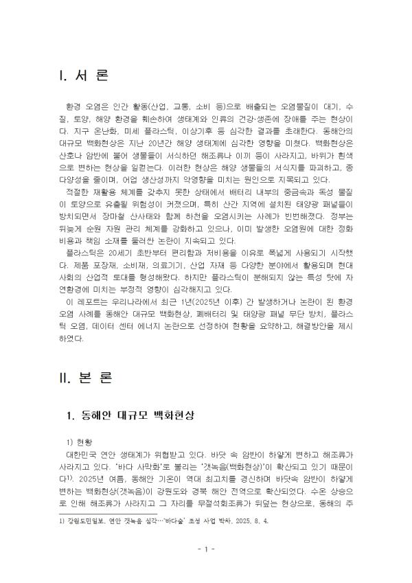 ¿ì¸®³ª¶ó¿¡¼­ ÃÖ±Ù 1³â(2025³â ÀÌÈÄ) °£ ¹ß»ýÇϰųª ³í¶õÀÌ µÈ ȯ°æ¿À¿° »ç·Ê¸¦ ¼¼ °¡Áö ÀÌ»ó ¼±Á¤ÇÏ¿© ÇöȲÀ» ¿ä¾àÇϰí, ÇØ°á¹æ¾ÈÀ» Á¦½ÃÇØ º¸½Ã¿À.
