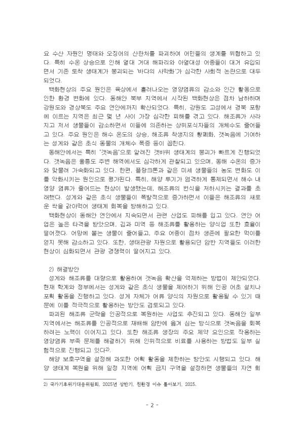 . 2025³â ¿©¸§, µ¿ÇØ¾È ±â¿ÂÀÌ ¿ª´ë ÃÖ°íÄ¡¸¦ °æ½ÅÇÏ¸ç ¹Ù´å¼Ó ¾Ï¹ÝÀÌ ÇϾé°Ô º¯ÇÏ´Â ¹éÈ­Çö»ó(°¹³ìÀ½)ÀÌ °­¿øµµ¿Í °æºÏ ÇØ¾È Àü¿ªÀ¸·Î È®»êµÇ¾ú´Ù. ¼ö¿Â »ó½ÂÀ¸·Î ÀÎÇØ ÇØÁ¶·ù°¡ »ç¶óÁö°í ±× ÀÚ¸®¸¦ ¹«Àý¼®È¸Á¶·ù°¡ µÚµ¤´Â Çö»óÀ¸·Î, µ¿ÇØÀÇ ÁÖ¿ä ¼ö»ê ÀÚ¿øÀÎ ¸íÅÂ¿Í ¿À¡¾îÀÇ »ê¶õó¸¦ ÆÄ±«ÇÏ¿© ¾î¹ÎµéÀÇ »ý°è¸¦ À§ÇùÇϰí ÀÖ´Ù. ƯÈ÷ ¼ö¿Â »ó½ÂÀ¸·Î ÀÎÇØ ¿­´ë °Å´ë ÇØÆÄ¸®¿Í ¾Æ¿­´ë¼º ¾îÁ¾µéÀÌ ´ë°Å À¯ÀԵǸ鼭 ±âÁ¸ ÅäÂø »ýŰ谡 ºØ±«µÇ´Â '¹Ù´ÙÀÇ »ç¸·È­'°¡ ½É°¢ÇÑ »çȸÀû ³í¶õÀ¸·Î ´ëµÎµÇ¾ú´Ù.