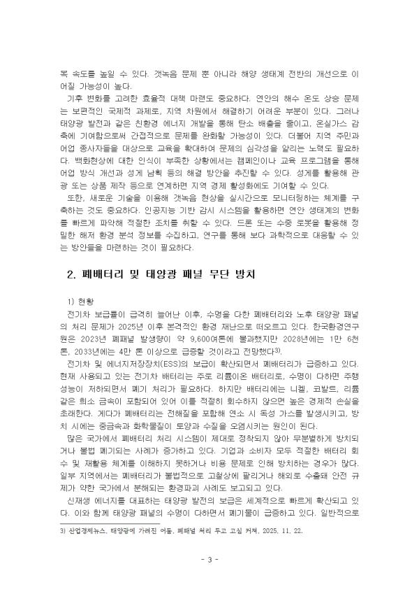 ÀûÀýÇÑ ÀçȰ¿ë ü°è¸¦ °®ÃßÁö ¸øÇÑ »óÅ¿¡¼­ ¹èÅ͸® ³»ºÎÀÇ Á߱ݼӰú µ¶¼º ¹°ÁúÀÌ Åä¾çÀ¸·Î À¯ÃâµÉ À§Ç輺ÀÌ Ä¿Á³À¸¸ç, ƯÈ÷ »ê°£ Áö¿ª¿¡ ¼³Ä¡µÈ ž籤 ÆÐ³ÎµéÀÌ ¹æÄ¡µÇ¸é¼­ À帶ö »ê»çÅÂ¿Í ÇÔ²² ÇÏõÀ» ¿À¿°½ÃŰ´Â »ç·Ê°¡ ºó¹øÇØÁ³´Ù. Á¤ºÎ´Â µÚ´Ê°Ô ¼ø¿ø ÀÚ¿ø °ü¸® ü°è¸¦ °­È­Çϰí ÀÖÀ¸³ª, ÀÌ¹Ì ¹ß»ýÇÑ ¿À¿°¿ø¿¡ ´ëÇÑ Á¤È­ ºñ¿ë°ú Ã¥ÀÓ ¼ÒÀ縦 µÑ·¯½Ñ ³í¶õÀÌ Áö¼ÓµÇ°í ÀÖ´Ù.