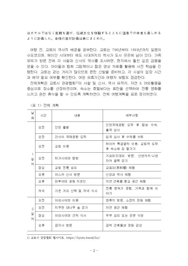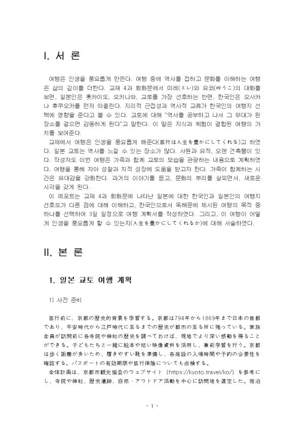 ÀÌ ·¹Æ÷Æ®´Â ±³Àç 4°ú ȸȭ¹®¿¡ ³ªÅ¸³­ ÀϺ»¿¡ ´ëÇÑ Çѱ¹Àΰú ÀϺ»ÀÎÀÇ ¿©ÇàÁö ¼±È£µµ°¡ ´Ù¸¥ Á¡¿¡ ´ëÇØ ÀÌÇØÇϰí, Çѱ¹ÀÎÀ¸·Î¼­ µ¶Çع®¿¡ Á¦½ÃµÈ ¿©ÇàÀÇ ¸ñÀû Áß Çϳª¸¦ ¼±ÅÃÇÏ¿© 3ÀÏ ÀÏÁ¤À¸·Î ¿©Çà °èȹ¼­¸¦ ÀÛ¼ºÇÏ¿´´Ù. ±×¸®°í, ÀÌ ¿©ÇàÀÌ ¾î¶»°Ô ÀλýÀ» dz¿ä·Ó°Ô ÇÒ ¼ö ÀÖ´ÂÁö(ìÑßæªòù¥ª«ªËª·ªÆª¯ªìªëª«)¿¡ ´ëÇØ ¼­¼úÇÏ¿´´Ù.