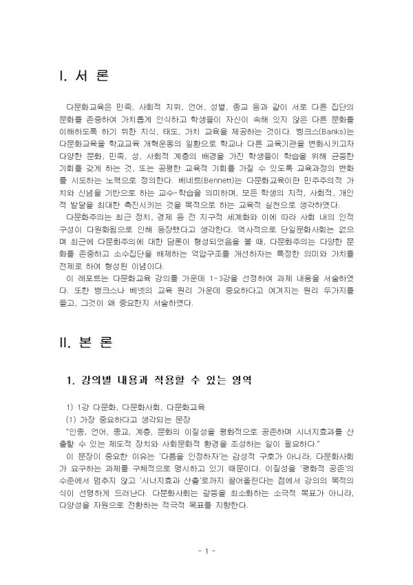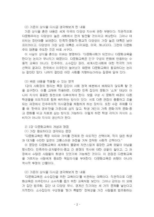 1) °¡Àå Áß¿äÇÏ´Ù°í »ý°¢µÇ´Â ¹®Àå(°ÀÇ ½Ã °Á¶µÈ ³»¿ë) 2) ±âÁ¸ÀÇ »ó½ÄÀ» ´Ù½Ã±Ý »ý°¢Çغ¸°Ô ÇÑ ³»¿ë 3) ¹è¿î ³»¿ëÀ» Àû¿ëÇÒ ¼ö ÀÖ´Â ¿µ¿ª(±³Àç, ¼ö¾÷¹æ½Ä, °üÁ¡, ÀÚ³à´ëÈ, »çȸÀû ½Çõ µîµî) 2. (15Á¡) ¹ðÅ©½º³ª º£³ÝÀÇ ±³À° ¿ø¸® °¡¿îµ¥ Áß¿äÇÏ´Ù°í ¿©°ÜÁö´Â ¿ø¸® µÎ°¡Áö¸¦ µé°í, ±×°ÍÀÌ ¿Ö Áß¿äÇÑÁö(°³ÀÎÀû °æÇèµµ °¡´É) ÇÑ ¹®´Ü¾¿ ÀÌÀ¯¸¦ ¾²½Ã¿À. * AI¸¦ »ç¿ëÇÑ °æ¿ì, Áö½Ã¾î¿Í AIÀÇ ´äÀ» ĸÃÄÇÏ¿© Á¦½ÃÇÒ °Í. - ¸ñ Â÷ - I. ¼ ·Ð II. º» ·Ð 1. °ÀǺ° ³»¿ë°ú Àû¿ëÇÒ ¼ö ÀÖ´Â ¿µ¿ª 2. ¹ðÅ©½º³ª º£³ÝÀÇ ±³À° ¿ø¸® °¡¿îµ¥ Áß¿äÇÑ ¿ø¸® III. °á ·Ð Âü°í¹®Çå ** ÇÔ²² Á¦°øµÇ´Â Âü°íÀÚ·á ÇÑ±ÛÆÄÀÏ ** 1. 1° ´Ù¹®È, ´Ù¹®È»çȸ, ´Ù¹®È±³À°.hwp 2. 2° ´Ù¹®È±³À°ÀÇ °³³ä°ú ÀïÁ¡.hwp 3. 3° ´Ù¹®È¼º°ú ¼¼°è½Ã¹Î¼º.hwp 4. 4° ´Ù¹®È±³À°ÀÇ ´Ù¾çÇÑ Â÷¿ø.hwp 5. 5° ´Ù¹®È±³À°ÀÇ ±¹Á¦Àû µ¿Çâ°ú ÀǹÌ.hwp 6. 6° Çѱ¹ ´Ù¹®È±³À° Á¤Ã¥ÀÇ Àü°³ °úÁ¤.hwp 7. ¹ðÅ©½º¿Í º£³ÝÀÇ ±³À° ¿ø¸®.hwp 8. ¹ðÅ©½º¿Í º£³ÝÀÇ ±³À° ¿ø¸®2.hwp 9. º£³ÝÀÇ ±³À°¿ø¸®.hwp 10. º¬Å©½ºÀÇ ±³À°¿ø¸®.hwp ¢ºÀÚ·á³»¿ë ¹Ì¸®º¸±â