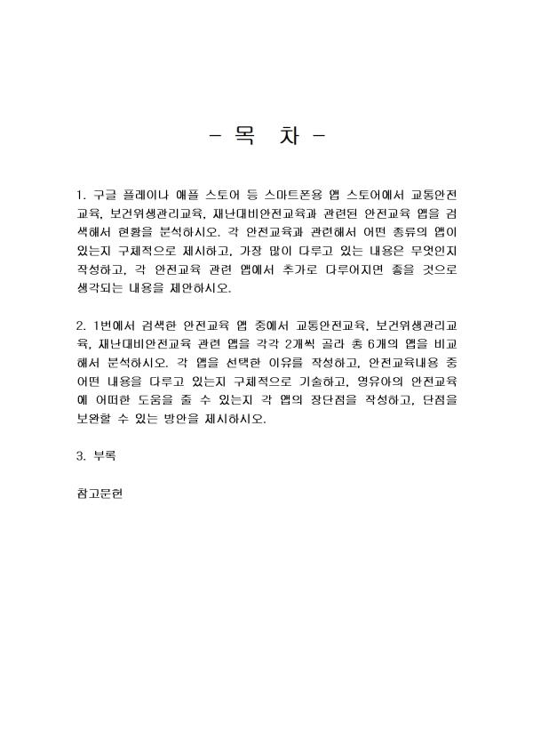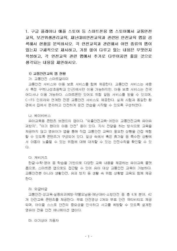 1. ±¸±Û Ç÷¹À̳ª ¾ÖÇà ½ºÅä¾î µî ½º¸¶Æ®Æù¿ë ¾Û ½ºÅä¾î¿¡¼ ±³Åë¾ÈÀü±³À°, º¸°ÇÀ§»ý°ü¸®±³À°, Àç³´ëºñ¾ÈÀü±³À°°ú °ü·ÃµÈ ¾ÈÀü±³À° ¾ÛÀ» °Ë»öÇØ¼ ÇöȲÀ» ºÐ¼®ÇϽÿÀ(15Á¡). °¢ ¾ÈÀü±³À°°ú °ü·ÃÇØ¼ ¾î¶² Á¾·ùÀÇ ¾ÛÀÌ ÀÖ´ÂÁö ±¸Ã¼ÀûÀ¸·Î Á¦½ÃÇϰí, °¡Àå ¸¹ÀÌ ´Ù·ç°í ÀÖ´Â ³»¿ëÀº ¹«¾ùÀÎÁö ÀÛ¼ºÇϰí, °¢ ¾ÈÀü±³À° °ü·Ã ¾Û¿¡¼ Ãß°¡·Î ´Ù·ç¾îÁö¸é ÁÁÀ» °ÍÀ¸·Î »ý°¢µÇ´Â ³»¿ëÀ» Á¦¾ÈÇϽÿÀ. 2. 1¹ø¿¡¼ °Ë»öÇÑ ¾ÈÀü±³À° ¾Û Áß¿¡¼ ±³Åë¾ÈÀü±³À°, º¸°ÇÀ§»ý°ü¸®±³À°, Àç³´ëºñ¾ÈÀü±³À° °ü·Ã ¾ÛÀ» °¢°¢ 2°³¾¿ °ñ¶ó ÃÑ 6°³ÀÇ ¾ÛÀ» ºñ±³Çؼ ºÐ¼®ÇϽÿÀ(15Á¡). °¢ ¾ÛÀ» ¼±ÅÃÇÑ ÀÌÀ¯¸¦ ÀÛ¼ºÇϰí, ¾ÈÀü±³À°³»¿ë Áß ¾î¶² ³»¿ëÀ» ´Ù·ç°í ÀÖ´ÂÁö ±¸Ã¼ÀûÀ¸·Î ±â¼úÇϰí, ¿µÀ¯¾ÆÀÇ ¾ÈÀü±³À°¿¡ ¾î¶°ÇÑ µµ¿òÀ» ÁÙ ¼ö ÀÖ´ÂÁö °¢ ¾ÛÀÇ Àå´ÜÁ¡À» ÀÛ¼ºÇϰí, ´ÜÁ¡À» º¸¿ÏÇÒ ¼ö ÀÖ´Â ¹æ¾ÈÀ» Á¦½ÃÇϽÿÀ. - ¸ñ Â÷ - 1. ±¸±Û Ç÷¹À̳ª ¾ÖÇà ½ºÅä¾î µî ½º¸¶Æ®Æù¿ë ¾Û ½ºÅä¾î¿¡¼ ±³Åë¾ÈÀü±³À°, º¸°ÇÀ§»ý°ü¸®±³À°, Àç³´ëºñ¾ÈÀü±³À°°ú °ü·ÃµÈ ¾ÈÀü±³À° ¾ÛÀ» °Ë»öÇØ¼ ÇöȲÀ» ºÐ¼®ÇϽÿÀ. °¢ ¾ÈÀü±³À°°ú °ü·ÃÇØ¼ ¾î¶² Á¾·ùÀÇ ¾ÛÀÌ ÀÖ´ÂÁö ±¸Ã¼ÀûÀ¸·Î Á¦½ÃÇϰí, °¡Àå ¸¹ÀÌ ´Ù·ç°í ÀÖ´Â ³»¿ëÀº ¹«¾ùÀÎÁö ÀÛ¼ºÇϰí, °¢ ¾ÈÀü±³À° °ü·Ã ¾Û¿¡¼ Ãß°¡·Î ´Ù·ç¾îÁö¸é ÁÁÀ» °ÍÀ¸·Î »ý°¢µÇ´Â ³»¿ëÀ» Á¦¾ÈÇϽÿÀ. 2. 1¹ø¿¡¼ °Ë»öÇÑ ¾ÈÀü±³À° ¾Û Áß¿¡¼ ±³Åë¾ÈÀü±³À°, º¸°ÇÀ§»ý°ü¸®±³À°, Àç³´ëºñ¾ÈÀü±³À° °ü·Ã ¾ÛÀ» °¢°¢ 2°³¾¿ °ñ¶ó ÃÑ 6°³ÀÇ ¾ÛÀ» ºñ±³Çؼ ºÐ¼®ÇϽÿÀ. °¢ ¾ÛÀ» ¼±ÅÃÇÑ ÀÌÀ¯¸¦ ÀÛ¼ºÇϰí, ¾ÈÀü±³À°³»¿ë Áß ¾î¶² ³»¿ëÀ» ´Ù·ç°í ÀÖ´ÂÁö ±¸Ã¼ÀûÀ¸·Î ±â¼úÇϰí, ¿µÀ¯¾ÆÀÇ ¾ÈÀü±³À°¿¡ ¾î¶°ÇÑ µµ¿òÀ» ÁÙ ¼ö ÀÖ´ÂÁö °¢ ¾ÛÀÇ Àå´ÜÁ¡À» ÀÛ¼ºÇϰí, ´ÜÁ¡À» º¸¿ÏÇÒ ¼ö ÀÖ´Â ¹æ¾ÈÀ» Á¦½ÃÇϽÿÀ. 3. ºÎ·Ï Âü°í¹®Çå ** ÇÔ²² Á¦°øµÇ´Â Âü°íÀÚ·á ÇÑ±ÛÆÄÀÏ ** 1. ±³Åë¾ÈÀü±³À° °ü·Ã ¾Û.hwp 2. º¸°ÇÀ§»ý°ü¸®±³À° °ü·Ã ¾Û.hwp 3. Àç³´ëºñ¾ÈÀü±³À° °ü·Ã ¾Û.hwp 4. ±³Åë¾ÈÀü±³À° ¾Û ºñ±³ ºÐ¼®.hwp 5. ±³Åë¾ÈÀü±³À° ¾Û ºñ±³ ºÐ¼®2.hwp 6. º¸°ÇÀ§»ý°ü¸®±³À° ¾Û ºñ±³ ºÐ¼®.hwp 7. º¸°ÇÀ§»ý°ü¸®±³À° ¾Û ºñ±³ ºÐ¼®2.hwp 8. Àç³´ëºñ¾ÈÀü±³À° ¾Û ºñ±³ ºÐ¼®.hwp 9. Àç³´ëºñ¾ÈÀü±³À° ¾Û ºñ±³ ºÐ¼®2.hwp ¢ºÀÚ·á³»¿ë ¹Ì¸®º¸±â