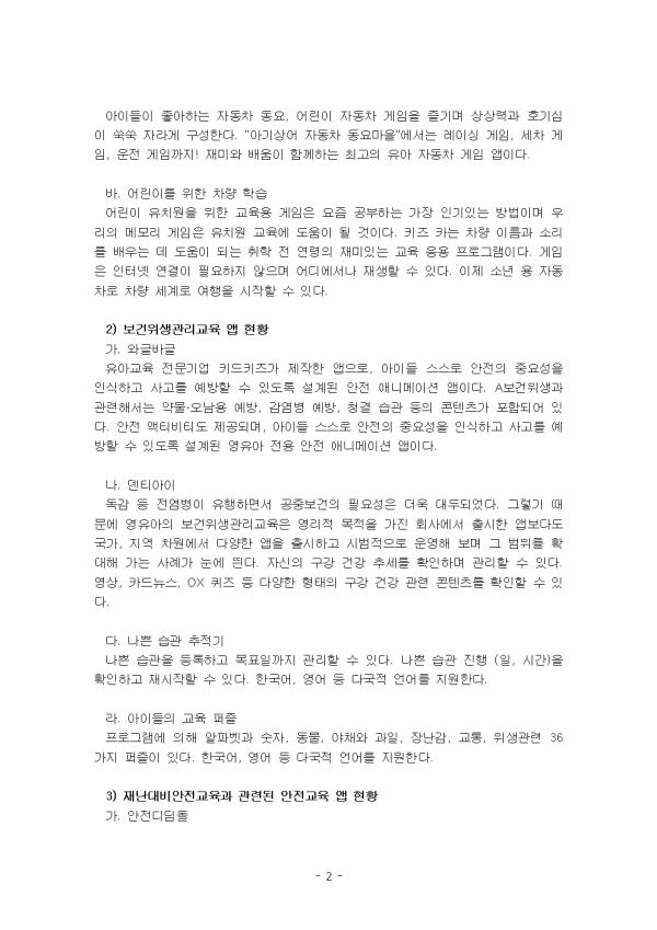 1) ±³Åë¾ÈÀü±³À° ¾Û ÇöȲ °¡. ±³Åë¾ÈÀü ½º¸¶Æ®¾Ë¸®¹Ì ±³Åë¾ÈÀü ¼ºñ½º¿Í ¾Æµ¿ º¸È£ ¼ºñ½º¸¦ ÇÔ²² Á¦°øÇÑ´Ù. ±³Åë¾ÈÀü ¼ºñ½º´Â ¼¼Á¾½Ã ƯÁ¤ ±¸¿ª(³ª¼ºÃʵîÇб³ ÀαÙ)¿¡¼¸¸ ÀÌ¿ë °¡´ÉÇÏÁö¸¸, ¾Æµ¿ º¸È£ ¼ºñ½º´Â Àü±¹ ¾îµð¼³ª ÀÌ¿ë °¡´ÉÇÏ´Ù. ½º¸¶Æ®Æù¸¸ À־ À§Çè ¾Ë¸² ¼ºñ½º¸¦ ¹ÞÀ» ¼ö ÀÖÀ¸¸ç, C-ITS ÀÎÇÁ¶ó¿Í ¿¬°èÇÑ Àü¹® ±³Åë¾ÈÀü ¼ºñ½ºµµ Á¦°øÇÑ´Ù. ½ÇÁ¦ ½ÃÇè°ú µ¿ÀÏÇÑ È¯°æ¿¡¼ Áý¿¡¼ Æí¸®ÇÏ°í ¾ÈÀüÇÏ°Ô ¿îÀü ¿¬½ÀÀ» ½ÃÀÛÇÒ ¼ö ÀÖµµ·Ï ±¸¼ºÇÏ¿´´Ù. ³ª. º£À̺ñ¹ö½º À¯¾Æ±³À°¿ë ÄÜÅÙÃ÷ ºê·£µåÀÇ ¾ÛÀÌ´Ù. "¿ÜÃâ¾ÈÀü±³À°-¾î¸°ÀÌ ±³Åë¾ÈÀü±³À° À¯¾ÆÀ¯±«¹æÁö", ¡°¾Æ±â ÆÒ´õÀÇ ¾Æµ¿ ¾ÈÀü¡± µîÀÌ ÀÖ´Ù. Áö½Ä Àü´ÞÀ» ÇÏ´Â ¹æ½ÄÀ¸·Î ±³À°À» Á¦°øÇÏÁö ¾Ê°í ¿µÀ¯¾Æ°¡ ¾ÛÀ» ÅëÇØ Á÷Á¢ ±³Åë¾ÈÀü ±³À°ÀÌ ÇÊ¿äÇÑ »óȲÀ» °£Á¢ üÇèÇÒ ¼ö ÀÖµµ·Ï ÄÜÅÙÃ÷°¡ ±¸¼ºµÇ¾î ÀÖ´Ù. ÀÏ»ó ¼Ó¿¡¼ ȤÀº ÈÞ°¡Ã¶ µî Ư¼öÇÑ »óȲ¿¡¼ ¾Æµ¿ÀÌ ³ëÃâµÉ ¼ö ÀÖ´Â À§Çè¿¡ ´ëÇØ ´ëóÇÒ ¼ö ÀÖ´Â ¾ÈÀü¼öÄ¢À» È®ÀÎÇÒ ¼ö ÀÖ´Ù. ´Ù. ijºñŰÁî Çѱۡ¤¼öÇС¤¿µ¾î µî ÇнÀÀ» ±â¹ÝÀ¸·Î ´Ù¾çÇÑ ±³À° ³»¿ëÀ» Á¦°øÇÏ´Â À¯¾Æ±³À° Ç÷§ÆûÀ¸·Î, ½º¸¶Æ®Æù ¾ÛÀ¸·Îµµ Á¢±ÙÇÒ ¼ö ÀÖ¾î À¯¾Æ ´ë»ó ±³Åë¾ÈÀü ±³À°ÀÌ °¡´ÉÇÏ´Ù. ±³Åë¾ÈÀü»Ó ¾Æ´Ï¶ó »ýȰ¾ÈÀü, À¯±« ¹æÁö µî »ýȰ ¼Ó À§Çè »óȲº° ±³À°µµ ÇÔ²² Á¦°øÇÑ´Ù. ¶ó. ¿Í±Û¹Ù±Û ±³Åë¾ÈÀü¡¤¼º±³À°¡¤½ÇÁ¾À¯±«¿¹¹æ¡¤¾à¹°¿À³²¿ë¡¤Àç³´ëºñ¡¤¼Ò¹æ¾ÈÀü µî ÃÑ 6°³ ºÐ¾ß, 42°³ ¾ÈÀü±³À° ÄÜÅÙÃ÷¸¦ Á¦°øÇÑ´Ù. ¹«·á ¾ÈÀü¿µ»ó 2°³¿Í ¹«·á ¾ÈÀü ¾×ƼºñƼµµ Á¦°øµÇ¸ç, ¾ÆÀÌµé ½º½º·Î ¾ÈÀüÀÇ Á߿伺À» ÀνÄÇÏ°í »ç°í¸¦ ¿¹¹æÇÒ ¼ö ÀÖµµ·Ï ¼³°èµÈ ¿µÀ¯¾Æ Àü¿ë ¾ÈÀü ¾Ö´Ï¸ÞÀÌ¼Ç ¾ÛÀÌ´Ù. ¸¶. ¾Æ±â»ó¾î ÀÚµ¿Â÷ ¾ÆÀ̵éÀÌ ÁÁ¾ÆÇÏ´Â ÀÚµ¿Â÷ µ¿¿ä, ¾î¸°ÀÌ ÀÚµ¿Â÷ °ÔÀÓÀ» Áñ±â¸ç »ó»ó·Â°ú È£±â½ÉÀÌ ¾¦¾¦ ÀÚ¶ó°Ô ±¸¼ºÇÑ´Ù. "¾Æ±â»ó¾î ÀÚµ¿Â÷ µ¿¿ä¸¶À»"¿¡¼´Â ·¹ÀÌ½Ì °ÔÀÓ, ¼¼Â÷ °ÔÀÓ, ¿îÀü °ÔÀÓ±îÁö! Àç¹Ì¿Í ¹è¿òÀÌ ÇÔ²²ÇÏ´Â ÃÖ°íÀÇ À¯¾Æ ÀÚµ¿Â÷ °ÔÀÓ ¾ÛÀÌ´Ù. ¹Ù. ¾î¸°À̸¦ À§ÇÑ Â÷·® ÇнÀ ¾î¸°ÀÌ À¯Ä¡¿øÀ» À§ÇÑ ±³À°¿ë °ÔÀÓÀº ¿äÁò °øºÎÇÏ´Â °¡Àå ÀαâÀÖ´Â ¹æ¹ýÀÌ¸ç ¿ì¸®ÀÇ ¸Þ¸ð¸® °ÔÀÓÀº À¯Ä¡¿ø ±³À°¿¡ µµ¿òÀÌ µÉ °ÍÀÌ´Ù. ŰÁî Ä«´Â Â÷·® À̸§°ú ¼Ò¸®¸¦ ¹è¿ì´Â µ¥ µµ¿òÀÌ µÇ´Â ÃëÇÐ Àü ¿¬·ÉÀÇ Àç¹ÌÀÖ´Â ±³À° ÀÀ¿ë ÇÁ·Î±×·¥ÀÌ´Ù. °ÔÀÓÀº ÀÎÅÍ³Ý ¿¬°áÀÌ ÇÊ¿äÇÏÁö ¾ÊÀ¸¸ç ¾îµð¿¡¼³ª Àç»ýÇÒ ¼ö ÀÖ´Ù. ÀÌÁ¦ ¼Ò³â ¿ë ÀÚµ¿Â÷·Î Â÷·® ¼¼°è·Î ¿©ÇàÀ» ½ÃÀÛÇÒ ¼ö ÀÖ´Ù. 2) º¸°ÇÀ§»ý°ü¸®±³À° ¾Û ÇöȲ °¡. ¿Í±Û¹Ù±Û À¯¾Æ±³À° Àü¹®±â¾÷ ۵åŰÁî°¡ Á¦ÀÛÇÑ ¾ÛÀ¸·Î, ¾ÆÀÌµé ½º½º·Î ¾ÈÀüÀÇ Á߿伺À» ÀνÄÇÏ°í »ç°í¸¦ ¿¹¹æÇÒ ¼ö ÀÖµµ·Ï ¼³°èµÈ ¾ÈÀü ¾Ö´Ï¸ÞÀÌ¼Ç ¾ÛÀÌ´Ù. Aº¸°ÇÀ§»ý°ú °ü·ÃÇØ¼´Â ¾à¹°¡¤¿À³²¿ë ¿¹¹æ, °¨¿°º´ ¿¹¹æ, û°á ½À°ü µîÀÇ ÄÜÅÙÃ÷°¡ Æ÷ÇԵǾî ÀÖ´Ù. ¾ÈÀü ¾×ƼºñƼµµ Á¦°øµÇ¸ç, ¾ÆÀÌµé ½º½º·Î ¾ÈÀüÀÇ Á߿伺À» ÀνÄÇÏ°í »ç°í¸¦ ¿¹¹æÇÒ ¼ö ÀÖµµ·Ï ¼³°èµÈ ¿µÀ¯¾Æ Àü¿ë ¾ÈÀü ¾Ö´Ï¸ÞÀÌ¼Ç ¾ÛÀÌ´Ù. ³ª. µ§Æ¼¾ÆÀÌ µ¶°¨ µî Àü¿°º´ÀÌ À¯ÇàÇÏ¸é¼ °øÁߺ¸°ÇÀÇ Çʿ伺Àº ´õ¿í ´ëµÎµÇ¾ú´Ù. ±×·¸±â ¶§¹®¿¡ ¿µÀ¯¾ÆÀÇ º¸°ÇÀ§»ý°ü¸®±³À°Àº ¿µ¸®Àû ¸ñÀûÀ» °¡Áø ȸ»ç¿¡¼ Ãâ½ÃÇÑ ¾Ûº¸´Ùµµ ±¹°¡, Áö¿ª Â÷¿ø¿¡¼ ´Ù¾çÇÑ ¾ÛÀ» Ãâ½ÃÇÏ°í ½Ã¹üÀûÀ¸·Î ¿î¿µÇØ º¸¸ç ±× ¹üÀ§¸¦ È®´ëÇØ °¡´Â »ç·Ê°¡ ´«¿¡ ¶è´Ù. ÀÚ½ÅÀÇ ±¸° °Ç° Ãß¼¼¸¦ È®ÀÎÇÏ¸ç °ü¸®ÇÒ ¼ö ÀÖ´Ù. ¿µ»ó, Ä«µå´º½º, OX ÄûÁî µî ´Ù¾çÇÑ ÇüÅÂÀÇ ±¸° °Ç° °ü·Ã ÄÜÅÙÃ÷¸¦ È®ÀÎÇÒ ¼ö ÀÖ´Ù. - Áß·« - |