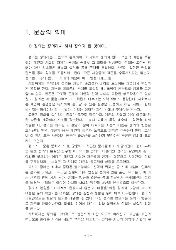 1) Á¤ÀÇ´Â Á¤ÀǶó¼ ÇØ¼ Á¤Àǰ¡ µÈ °ÍÀÌ´Ù. 2) ³»°¡ »ý°¢ÇÏ´Â °ÍÀÌ ¾Æ´Ï¶ó ÆÄ³ñƼÄÜÀÌ »ý°¢ÇÑ´Ù. 3) »ý°¢´çÇÏ´Â ÁÙ ¸ð¸£¸é¼ »ý°¢Çϰí ÀÖ´Ù. 2. °ÀǸ¦ 1°¿¡¼ 5°±îÁö ½ÃûÇϰí, ÀÌ¿¡ ±â¹ÝÇÏ¿© ¿¡¼¼À̸¦ ¾²½Ã¿À. 1) °ÀǸ¦ µè°í ³ª¼, Àڽſ¡°Ô °¡Àå ÀλóÀûÀÎ ¸» ȤÀº ³»¿ëÀÌ ¹«¾ùÀÎÁö 2°³¸¦ ÀûÀ¸½Ã¿À. 2) ÀÌ ¸» ȤÀº ³»¿ëÀÌ ¿Ö ÀλóÀûÀ̾ú´ÂÁö¸¦ ÀûÀ¸½Ã¿À. 3) ÀÌ ¸» ȤÀº ³»¿ëÀ» ÅëÇØ ³» »ý°¢ÀÇ º¯È°¡ ÀÖ¾ú´Ù¸é ¹«¾ùÀÎÁö¸¦ ÀûÀ¸½Ã¿À. - ¸ñ Â÷ - 1. ¹®ÀåÀÇ ÀÇ¹Ì 2. ¿¡¼¼ÀÌ Âü°í¹®Çå ** ÇÔ²² Á¦°øµÇ´Â Âü°íÀÚ·á ÇÑ±ÛÆÄÀÏ ** 1. ³»°¡ »ý°¢ÇÏ´Â °ÍÀÌ ¾Æ´Ï¶ó ÆÄ³ñƼÄÜÀÌ »ý°¢ÇÑ´Ù.hwp 2. ³»°¡ »ý°¢ÇÏ´Â °ÍÀÌ ¾Æ´Ï¶ó ÆÄ³ñƼÄÜÀÌ »ý°¢ÇÑ´Ù2.hwp 3. »ý°¢´çÇÏ´Â ÁÙ ¸ð¸£¸é¼ »ý°¢Çϰí ÀÖ´Ù.hwp 4. »ý°¢´çÇÏ´Â ÁÙ ¸ð¸£¸é¼ »ý°¢Çϰí ÀÖ´Ù2.hwp 5. Á¤ÀÇ´Â Á¤ÀǶó¼ ÇØ¼ Á¤Àǰ¡ µÈ °ÍÀÌ´Ù.hwp 6. Á¤ÀÇ´Â Á¤ÀǶó¼ ÇØ¼ Á¤Àǰ¡ µÈ °ÍÀÌ´Ù2.hwp 7. ¿¡¼¼ÀÌ ÀÛ¼º.hwp 8. ¿¡¼¼ÀÌ ÀÛ¼º2.hwp ¢ºÀÚ·á³»¿ë ¹Ì¸®º¸±â