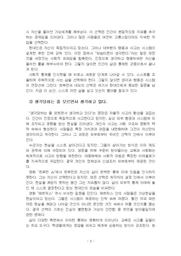 1) Á¤ÀÇ´Â Á¤ÀǶó¼ ÇØ¼ Á¤Àǰ¡ µÈ °ÍÀÌ´Ù. Á¤ÀÇ´Â Á¤ÀǶó´Â À̸§À¸·Î Á¸ÀçÇÏ¸ç ±× ÀÚü·Î Á¤Àǰ¡ µÈ´Ù. °´°üÀû ±âÁØÀ» ÃÊ¿ùÇÏ¿© °³Àΰú »çȸÀÇ ´Ù¾çÇÑ °üÁ¡µé ¼Ó¿¡¼ ±× Àǹ̸¦ Çü¼ºÇÑ´Ù. Á¤ÀÇ´Â °íÁ¤µÈ ÇüŰ¡ ¾Æ´Ñ Áö¼ÓÀûÀÎ ÇØ¼®°ú ½ÇõÀ» ÅëÇØ Á¸À縦 µå·¯³½´Ù. »çȸ´Â ÀÏÁ¤ÇÑ ¿øÄ¢°ú Áú¼¸¦ ÅëÇØ Á¤ÀǸ¦ Á¶À²ÇÏ·Á ÇÑ´Ù. ¸ðµç »ç¶÷µéÀÇ ±âÁØÀ» ÃæÁ·½ÃŰÁö´Â ¾Ê´Â´Ù. Á¤ÀÇ´Â ´Ù¼öÀÇ ÈûÀ̳ª ½Ã´ëÀû À̳信 µû¶ó º¯ÇüµÇ±âµµ ÇÑ´Ù. »çȸº¹ÁöÀÇ ¸Æ¶ô¿¡¼ Á¤ÀÇ´Â °³ÀÎÀÇ Á¸¾ö¼º°ú ±Ç¸®¸¦ º¸ÀåÇÏ´Â °úÁ¤¿¡¼ ÇÙ½ÉÀûÀÎ ¿ªÇÒÀ» ÇÑ´Ù. °¡³°ú °ÔÀ¸¸§ÀÇ °ü°è¸¦ °íÂûÇÒ ¶§, µµ´öÀû ÆÇ´ÜÀ¸·Î Á¤ÀǸ¦ °íÁ¤ÇÒ ¼ö ¾ø´Ù. ºó°ïÀº ±¸Á¶Àû ¹®Á¦¿Í °³ÀÎÀû ¼±Åà »çÀÌÀÇ º¹ÀâÇÑ »óÈ£ÀÛ¿ëÀ¸·Î Çü¼ºµÈ´Ù. Á¤ÀÇ´Â ÀÌ µÑÀ» ÀÌÇØÇϰí Á¶È·Ó°Ô ´Ù·ç·Á´Â ³ë·Â ¼Ó¿¡¼ µîÀåÇÑ´Ù. »çȸº¹Áö´Â °³ÀÎÀÌ Á¸¾ö¼ºÀ» À¯ÁöÇÏ¸ç »ì¾Æ°¥ ¼ö Àִ ȯ°æÀ» Á¶¼ºÇϰí À̸¦ »çȸ°¡ ÇÔ²² Ã¥ÀÓÁö´Â °úÁ¤À̶ó ÇÒ ¼ö ÀÖ´Ù. Á¤ÀÇ´Â ÀÌ·¯ÇÑ °úÁ¤ ¾È¿¡¼ ±¸Ã¼¼ºÀ» ¾ò´Â´Ù. ±³À°Àº Á¤ÀǸ¦ ½ÇÇöÇÏ´Â Áß¿äÇÑ µµ±¸·Î ÀÛµ¿ÇÑ´Ù. °³ÀÎÀÇ ÀÚ¸³°ú °èÃþ À̵¿À» À§ÇÑ ¹ßÆÇÀ» Á¦°øÇϸç ÀÚÁ¶¸¦ °Á¶ÇÑ´Ù. ±×·¯³ª ±³À°ÀÌ Æ¯Á¤ °èÃþÀÇ ÀÌÀ͸¸À» À§ÇØ ÀÛµ¿ÇÒ ¶§, Á¤ÀÇ´Â ¿Ö°îµÈ´Ù. °³²ÀÇ ¿ëÀÌ ´ëÇ¥ÇÏ´Â °èÃþÀû ¼¼½ÀÀº Á¤ÀÇÀÇ ºóÆ´À» µå·¯³½´Ù. ¹Ý¸é, °³ÃµÀÇ ¿ëÀº °³ÀÎÀÇ ´É·Â°ú ³ë·ÂÀ¸·Î Á¤ÀǸ¦ Ãß±¸ÇÏ·Á ÇÑ´Ù. ±×·¯³ª ÀÌ ¿ª½Ã ¸ðµç »ç¶÷¿¡°Ô µ¿µîÇÑ Ãâ¹ß¼±À» º¸ÀåÇÏÁö ¸øÇÑ´Ù¸é ¿ÏÀüÇÑ Á¤ÀÇ¿¡ µµ´ÞÇÏ±â ¾î·Æ´Ù. Á¤ÀÇÀÇ ±âÁØÀº ¹®È¿Í ½Ã´ë, °øµ¿Ã¼°¡ Á÷¸éÇÑ ¹®Á¦µé¿¡ µû¶ó ´Þ¶óÁø´Ù. Á¤Ä¡ ¿ìȸ¦ ÅëÇØ Á¤ÀÇÀÇ º»ÁúÀ» ޱ¸ÇÒ ¶§, ¿ì¸®´Â Á¤ÀÇÀÇ ´ÙÃþÀûÀÎ ¼º°ÝÀ» ¹ß°ßÇÏ°Ô µÈ´Ù. Á¤ÀǸ¦ ãÀ¸·Á´Â ¿©Á¤Àº °³Àΰú »çȸ°¡ Àڽſ¡°Ô ´øÁö´Â Áú¹®À¸·Î ½ÃÀ۵ȴÙ. Á¤ÀǸ¦ ±¸Ã¼ÈÇÏ·Á´Â ³ë·ÂÀº ±× ÀÚü·Î °³Àΰú °øµ¿Ã¼ÀÇ ¼ºÀåÀ» µµ¸ðÇÑ´Ù. ±âÂ÷°¡ ´Þ¸®´Â À§¿¡¼ Á߸³Àº ºÒ°¡´ÉÇÏ´Ù. ¼±ÅÃÀÇ È¸ÇÇ´Â °ð Áö¹è À̳信 ¾ÈÁÖÇÏ´Â °á°ú·Î À̾îÁø´Ù. ÁÖ¾îÁø »óȲ¿¡ ´ëÇØ ÀÔÀåÀ» Á¤ÇÏÁö ¾Ê´Â ¼ø°£, ¿ì¸®´Â ÀÌ¹Ì ±âÁ¸ ±Ç·ÂÀÇ Æí¿¡ ¼°Ô µÈ´Ù. Á¤ÀÇ´Â Çൿ°ú °á´ÜÀ» ÅëÇØ Çö½Ç¿¡¼ ±¸Ã¼ÈµÈ´Ù. Á¤ÀǸ¦ µÑ·¯½Ñ ³íÀǵéÀº ÀÌ»óÀÌ ¾Æ´Ï¶ó »çȸÀÇ ¹æÇâ°ú ½ÇõÀÇ ¿øµ¿·ÂÀ¸·Î ÀÛµ¿ÇÑ´Ù. Á¤ÀÇÀÇ º»ÁúÀº ±× ÀÚü·Î ¿Ï¼ºµÇÁö ¾Ê´Â´Ù. ¸¶À»À» À§ÇÑ Á¤Àǰ¡ ´Ù¶÷Áã »õ¹ÌÀÇ ¿©Á¤À» ÅëÇØ È®ÀεǴ °Íó·³, Á¤ÀÇ´Â ½Çõ°ú ¼ºÂûÀ» ÅëÇØ ºñ·Î¼Ò ±¸ÇöµÈ´Ù. Á¤ÀÇÀÇ °Å¿ï¸¸À¸·Î´Â Çö½ÇÀÇ ¹®Á¦¸¦ ÇØ°áÇÒ ¼ö ¾ø´Ù. ´ë½Å Á¤ÀǸ¦ ãÀ¸·Á´Â ³ë·Â°ú ÇൿÀÌ ±× ±âÁØÀ» ¸¸µé¾î³ª°£´Ù. ¸¶À»ÀÇ À§±â¿¡ ´ëÇÑ ³íÀÇ¿Í Çù·Â¿¡¼ Á¤ÀÇ´Â ½ÇÁúÀû Àǹ̸¦ ¾ò´Â´Ù. »çȸº¹Áö´Â Á¤ÀǸ¦ ±¸Ã¼ÀûÀ¸·Î ½ÇÇöÇϱâ À§ÇÑ µµ±¸·Î ÀÌÇØµÈ´Ù. °¡³À» °³ÀÎÀÇ Ã¥ÀÓÀ¸·Î µ¹¸®´Â ½Ã°¢Àº »çȸÀû ¸Æ¶ôÀ» ¹èÁ¦ÇÑ´Ù. Á¤ÀÇ´Â °³ÀÎÀÇ ÀÌÀͰú »çȸÀû ±¸Á¶ »çÀÌÀÇ ±äÀåÀ» Æ÷¿ëÇÏ¸ç ±× ¾È¿¡¼ ±ÕÇüÀ» Ãß±¸ÇÏ·Á ÇÑ´Ù. ÀÌ °úÁ¤¿¡¼ Á¤ÀÇ´Â ´ÜÀÏÇÑ ±âÁØÀÌ ¾Æ´Ï¶ó ´Ù¼öÀÇ ½Ã¼±°ú °æÇè ¼Ó¿¡¼ ±× ¸ð½ÀÀ» µå·¯³½´Ù. Á¤ÀÇÀÇ ¿ÏÀü¼ºÀº ±× ÀÚü·Î Á¸ÀçÇÏÁö ¾Ê´Â´Ù. °ÑÀ¸·Î´Â ¿Ïº®Çغ¸ÀÌÁö¸¸ ±× ¾È¿¡´Â ¸ð¼ø°ú ÇѰ谡 ³»ÀçÇÑ´Ù. °¢ÀÚÀÇ Á¤ÀÇ´Â °³ÀÎÀÌ ½º½º·Î °áÁ¤Çϸç, ±× ½ÇÇà °úÁ¤¿¡¼ »õ·Î¿î Àǹ̸¦ ¹ß°ßÇÑ´Ù. Á¤ÀÇ´Â ¼ö¸¹Àº °¡Ä¡¿Í À̳äÀÌ ±³Â÷ÇÏ´Â ÁöÁ¡¿¡¼ ¸Å ¼ø°£ »õ·Ó°Ô Á¤ÀǵȴÙ. 2) ³»°¡ »ý°¢ÇÏ´Â °ÍÀÌ ¾Æ´Ï¶ó ÆÄ³ñƼÄÜÀÌ »ý°¢ÇÑ´Ù. ÆÄ³ñƼÄÜÀº °¨½Ã¿Í ÅëÁ¦¶ó´Â Çö´ë »çȸÀÇ ÇÙ½É °³³äÀ» ´ã°í ÀÖ´Ù. Á¦·¹¹Ì º¥´ãÀÌ ¼³°èÇÑ ÀÌ ±¸Á¶´Â ¼ö¿ëÀÚ°¡ ¾ðÁ¦³ª °¨½Ã¹Þ°í ÀÖ´Ù´Â ÀνÄÀ» ÅëÇØ ÀÚ¹ßÀûÀ¸·Î ÇൿÀ» ±ÔÁ¦Çϵµ·Ï ¸¸µç´Ù. ¹°¸®Àû °¨½Ã°¡ ¾Æ´Ñ ½É¸®Àû ¸ÞÄ¿´ÏÁòÀ» ÅëÇØ ¿î¿ëµÈ´Ù. °¨½Ãž¿¡ °üÂûÀÚ°¡ ÀÖµç ¾øµç, ¼ö°¨ÀÚ´Â ÀÚ½ÅÀÌ °üÂû´çÇϰí ÀÖ´Ù°í ¹Ï´Â´Ù. ÀÌ·¯ÇÑ ½Ã½ºÅÛÀº Çö´ë »çȸÀÇ ´Ù¾çÇÑ ¿µ¿ª¿¡ ÆÛÁ® ÀÖ´Ù. Çö´ëÀÇ °³ÀÎÀº ÀÚÀ¯·Ó´Ù°í ¹Ï´Â´Ù. ÇÏÁö¸¸ ´Ù¼ö´Â »çȸÀû ±â´ë³ª ½Ã½ºÅÛÀÇ ±Ô¹ü¿¡ µû¶ó ÇൿÇÑ´Ù. ½º½º·Î »ý°¢ÇÑ´Ù°í ¹ÏÁö¸¸, »ç½Ç»ó ½Ã½ºÅÛÀÌ Â¥³õÀº Ʋ ¾È¿¡¼ »ç°íÇÑ´Ù. ¿µÈ 'Æ®·ç¸Õ ¼î'¿¡¼´Â ÁÖÀΰø Æ®·ç¸ÕÀÌ ½º½º·ÎÀÇ »îÀ» ÅëÁ¦ÇÑ´Ù°í ¹Ï´Â´Ù. ÇÏÁö¸¸ ±×´Â öÀúÈ÷ ¼³°èµÈ °¡Â¥ ¼¼°è ¼Ó¿¡¼ »ì¾Æ°£´Ù. À